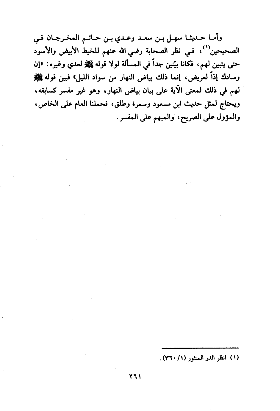 وأما حديثا سهل بن سعد وعدي بن حاتم المخرجان في الصحيحين، في نظر الصحابة رضي الله عنهم للخيط الأبيض والأسود حتى يتبين لهم، فكانا بينين جداً في المسألة لولا قوله - صلى الله عليه وسلم - لعدي وغيره: " إن وسادك إذاً لعريض، إنما ذلك بياض النهار من سواد الليل " فبين قوله - صلى الله عليه وسلم - لهم في ذلك لمعنى الآية على بيان يياض النهار، وهو غير مفسر كسابقه، ويحتاج لمثل حديث ابن مسعود وسمرة وطلق، فحملنا العام على الخاص، والمؤول على الصريح، والمبهم على المفسر.