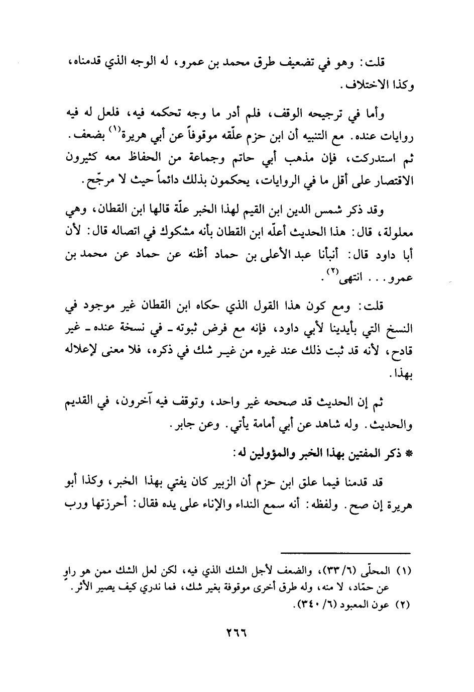 وقد ذكر شمس الدين ابن القيم لهذا الخبر علة قالها ابن القطان، وهي معلولة، قال: هذا الحديث أعله ابن القطان بأنه مشكوك في اتصاله قال: لأن أبا داود قال: أنبأنا عبد الأعلى بن حماد أظنه عن حماد عن محمد بن عمرو. . . انتهى.