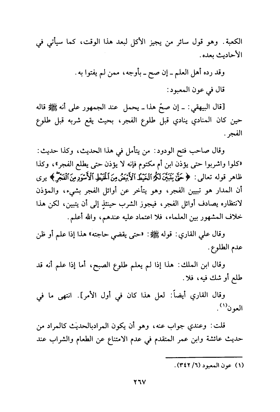 وقال صاحب فتح الودود: من يتأمل في هذا الحديث، وكذا حديث: " كلوا واشربوا حتى يؤذن ابن أم مكتوم فإنه لا يؤذن حتى يطلع الفجر "، وكذا ظاهر قوله تعالى: (حَتَّى يَتَبَيَّنَ لَكُمُ الْخَيْطُ الْأَبْيَضُ مِنَ الْخَيْطِ الْأَسْوَدِ مِنَ الْفَجْرِ) يرى أن المدار هو تبيين الفجر، وهو يتأخر عن أوائل الفجر بشيء، والمؤذن لانتظاره يصادف أوائل الفجر، فيجوز الشرب حينئذٍ إلى أن يتبين، لكن هذا خلاف المشهور بين العلماء، فلا اعتماد عليه عندهم، والله أعلم.