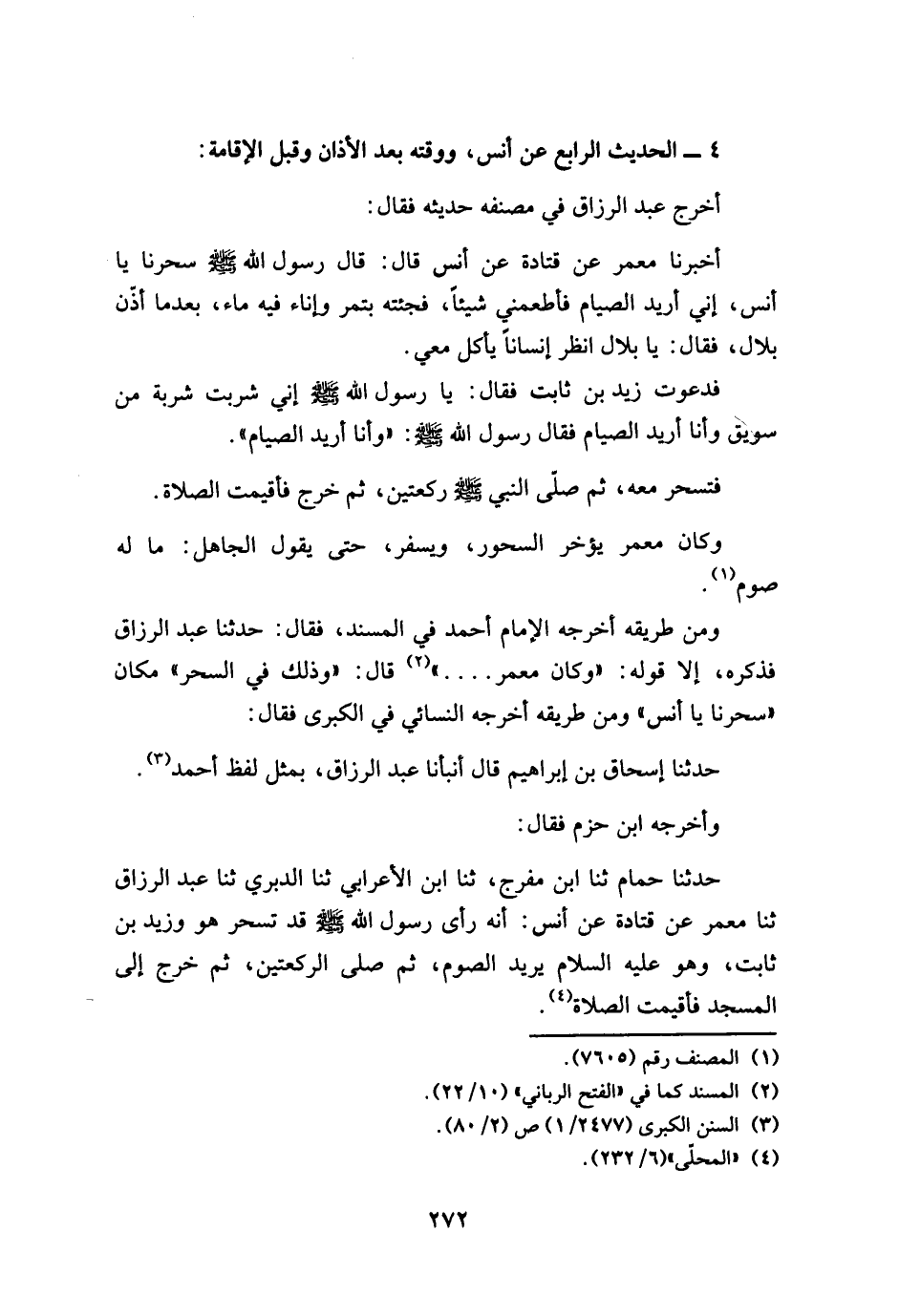 وأخرجه ابن حزم فقال: حدثنا حمام ثنا ابن مفرج، ثنا ابن الأعرابي ثنا الدبري ثنا عبد الرزاق ثنا معمر عن قتادة عن أنس: أنه رأى رسول الله - صلى الله عليه وسلم - قد تسحر هو وزيد بن ثابت، وهو عليه السلام يريد الصوم، ثم صلى الركعتين، ثم خرج إلى المسجد فأقيمت الصلاة.