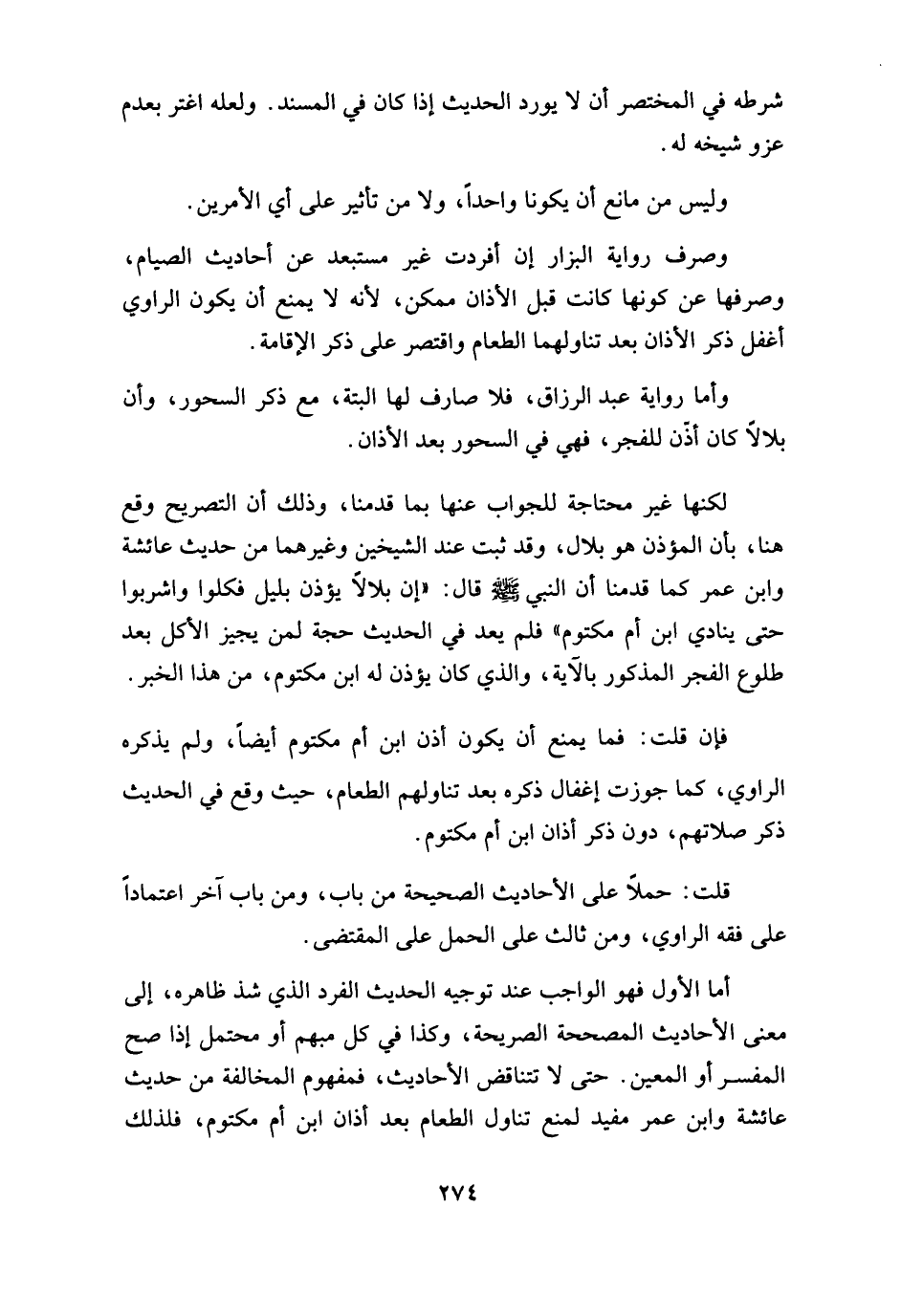 أما الأول فهو الواجب عند توجيه الحديث الفرد الذي شذ ظاهره، إلى معنى الأحاديث المصححة الصريحة، وكذا في كل مبهم أو محتمل إذا صح المفسر أو المعين. حتى لا تتناقض الأحاديث، فمفهوم المخالفة من حديث عائشة وابن عمر مفيد لمنع تناول الطعام بعد أذان ابن أم مكتوم، فلذلك