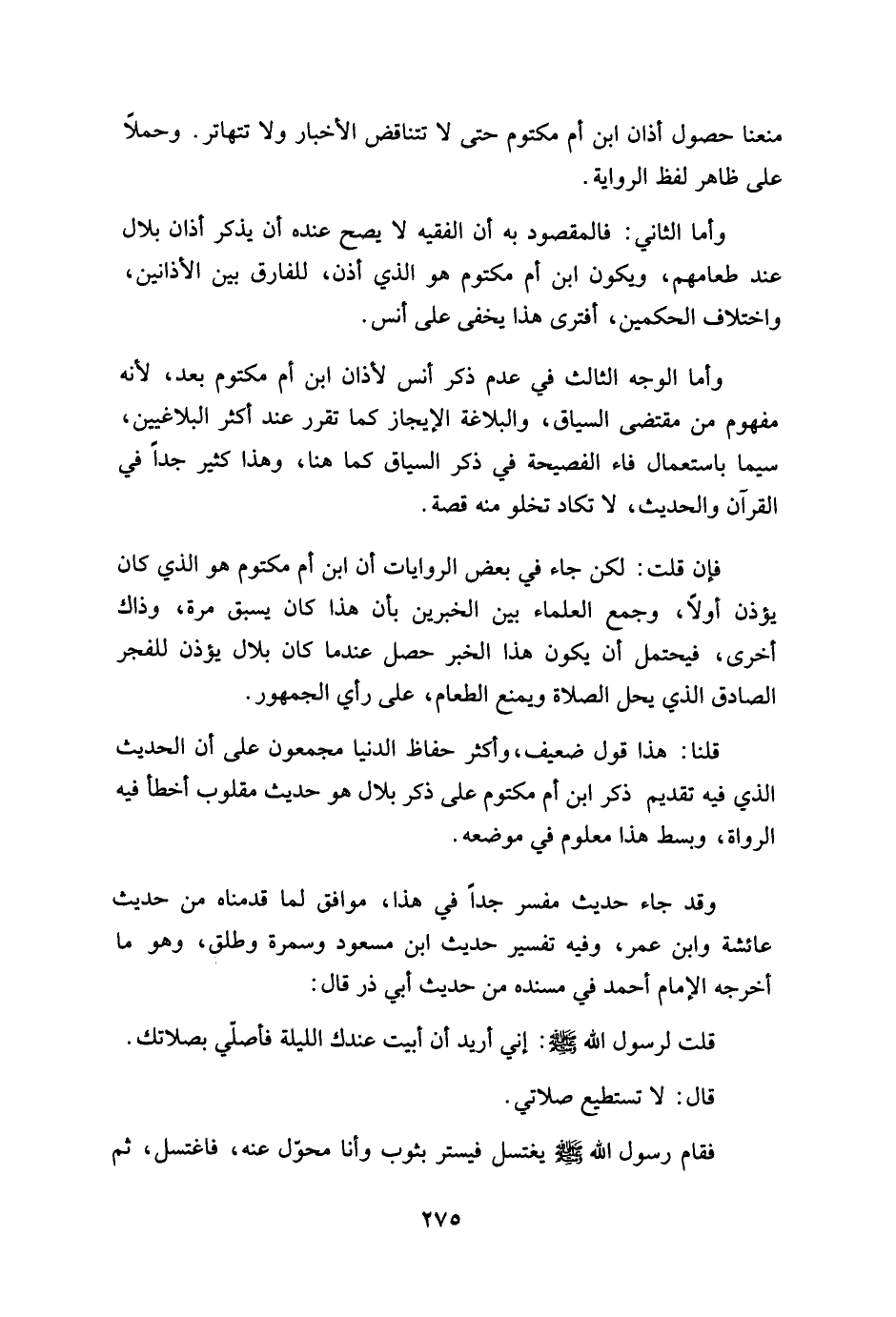 فإن قلت: لكن جاء في بعض الروايات أن ابن أم مكتوم هو الذي كان يؤذن أولاً، وجمع العلماء بين الخبرين بأن هذا كان يسبق مرة، وذاك أخرى، فيحتمل أن يكون هذا الخبر حصل عندما كان بلال يؤذن للفجر الصادق الذي يحل الصلاة ويمنع الطعام، على رأي الجمهور.