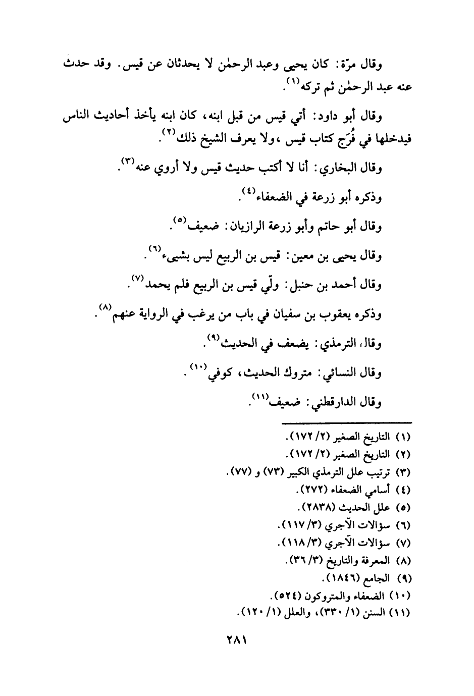 وقال مرة: كان يحيى وعبد الرحمن لا يحدثان عن قيس. وقد حدث عنه عبد الرحمن ثم تركه.