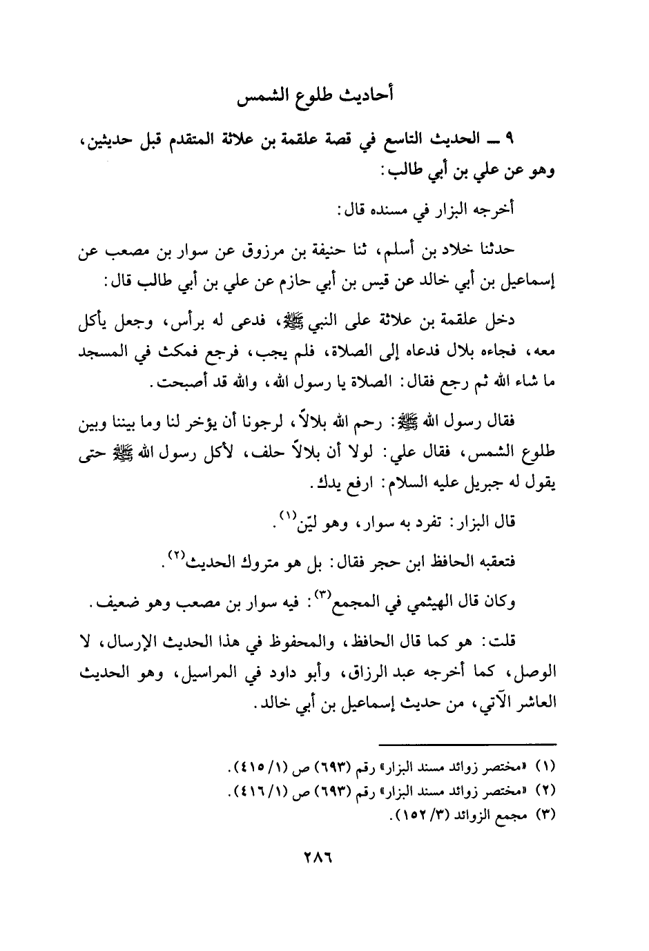 أخرجه البزار في مسنده قال: حدثنا خلاد بن أسلم، ثنا حنيفة بن مرزوق عن سوار بن مصعب عن إسماعيل بن أبي خالد عن قيس بن أبي حازم عن علي بن أبي طالب قال: دخل علقمة بن علاثة على النبي - صلى الله عليه وسلم -، فدعى له برأس، وجعل يأكل معه، فجاءه بلال فدعاه إلى الصلاة، فلم يجب، فرجع فمكث في المسجد ما شاء الله ثم رجع فقال: الصلاة يا رسول الله، والله قد أصبحت.