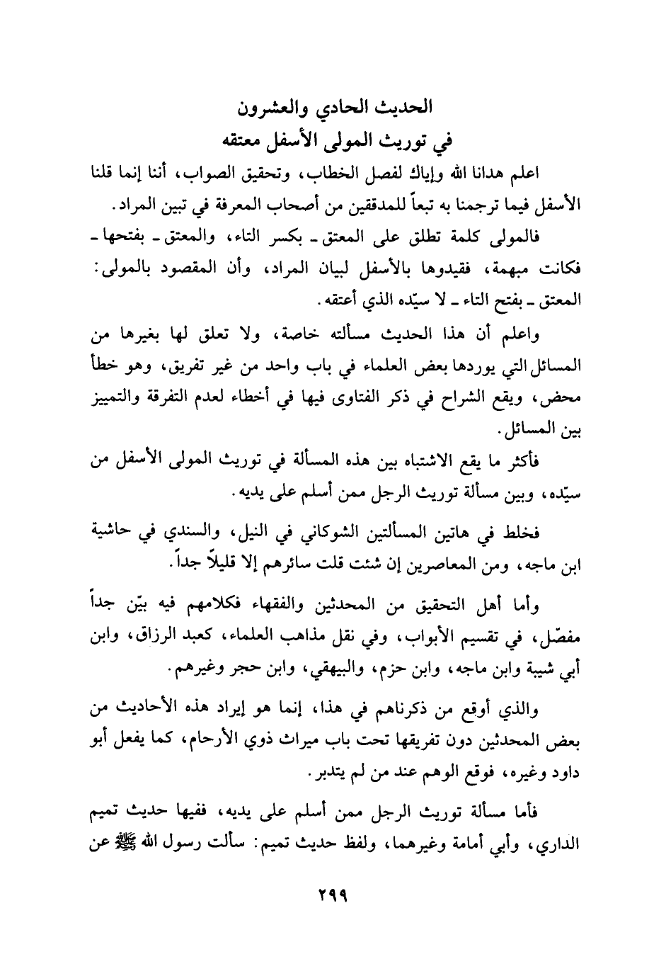 فأكثر ما يقع الاشتباه بين هذه المسألة في توريث المولى الأسفل من سيده، وبين مسألة توريث الرجل ممن أسلم على يديه.
