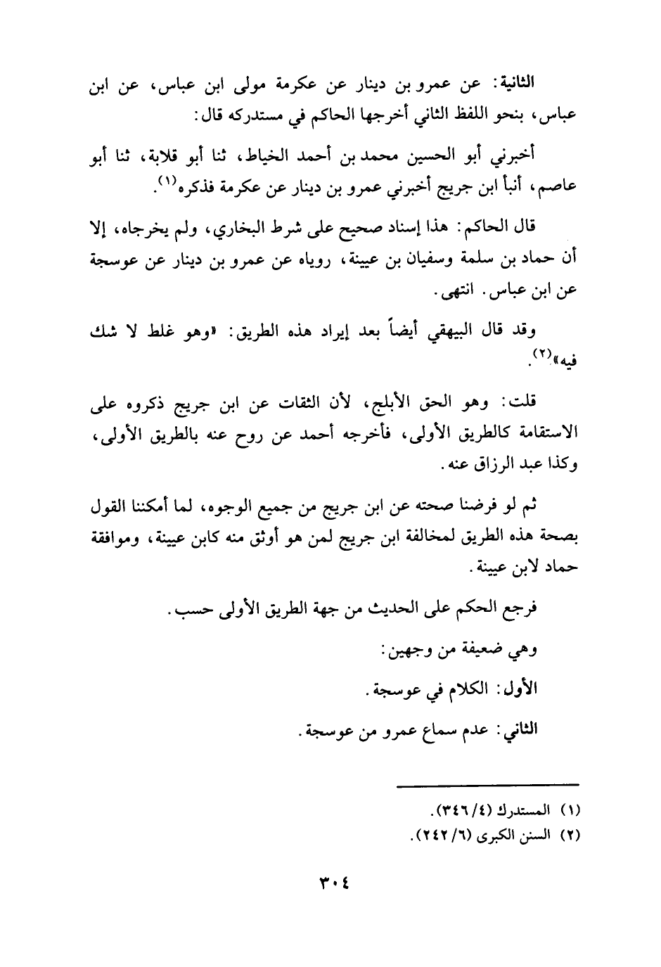 قال الحاكم: هذا إسناد صحيح على شرط البخاري، ولم يخرجاه، إلا أن حماد بن سلمة وسفيان بن عيينة، روياه عن عمرو بن دينار عن عوسجة عن ابن عباس. انتهى.