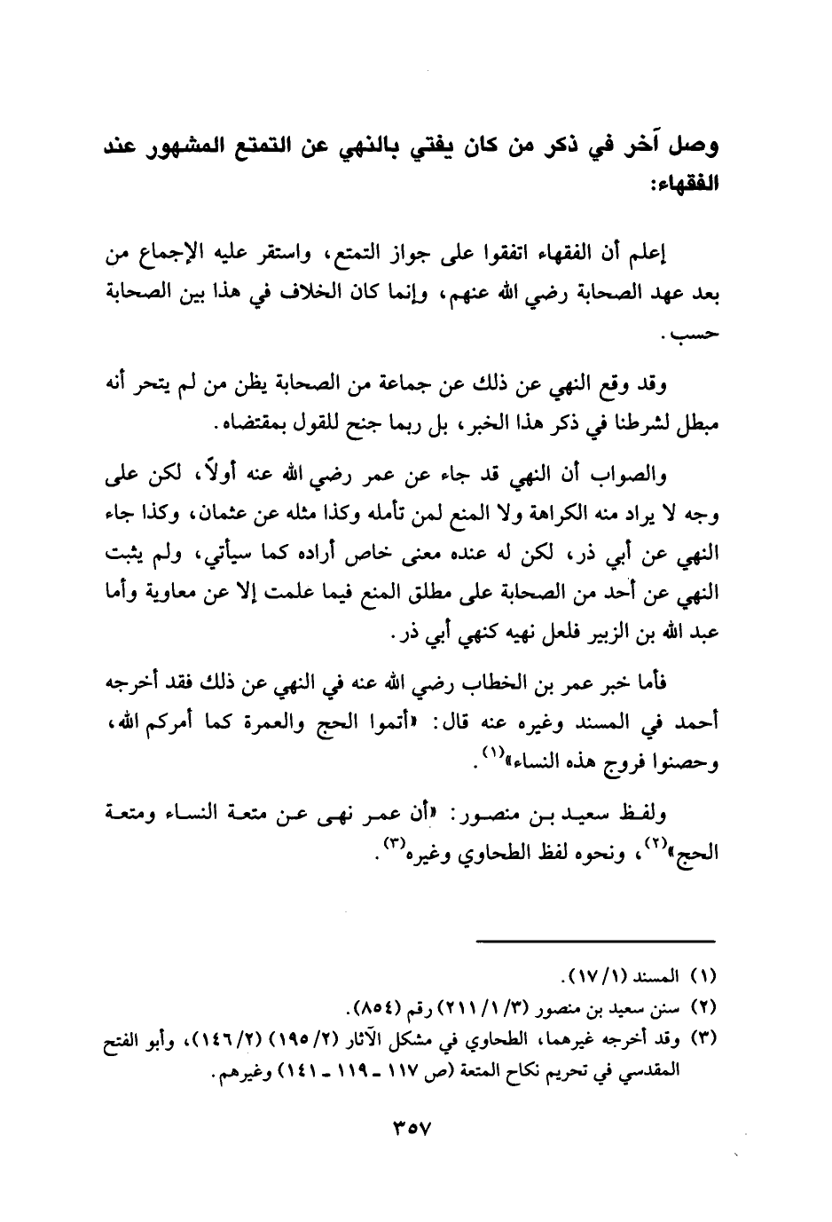 ولفظ سعيد بن منصور: " أن عمر نهى عن متعة النساء ومتعة الحج "، ونحوه لفظ الطحاوي وغيره.