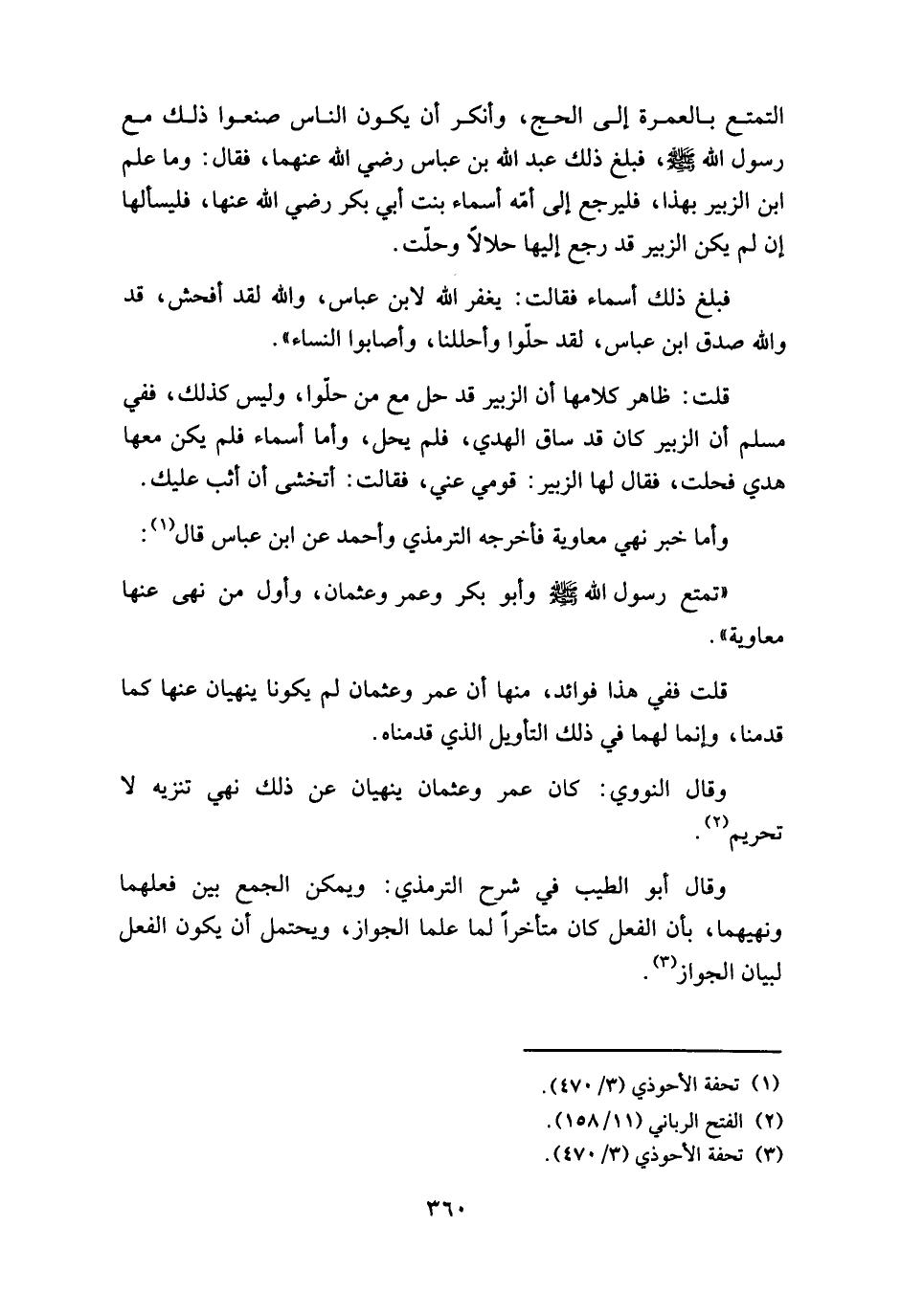التمتع بالعمرة إلى الحج، وأنكر أن يكون الناس صنعوا ذلك مع رسول الله - صلى الله عليه وسلم -، فبلغ ذلك عبد الله بن عباس رضي الله عنهما، فقال: وما علم ابن الزبير بهذا، فليرجع إلى أمّه أسماء بنت أبي بكر رضي الله عنها، فليسألها إن لم يكن الزبير قد رجع إليها حلالاً وحلّت.