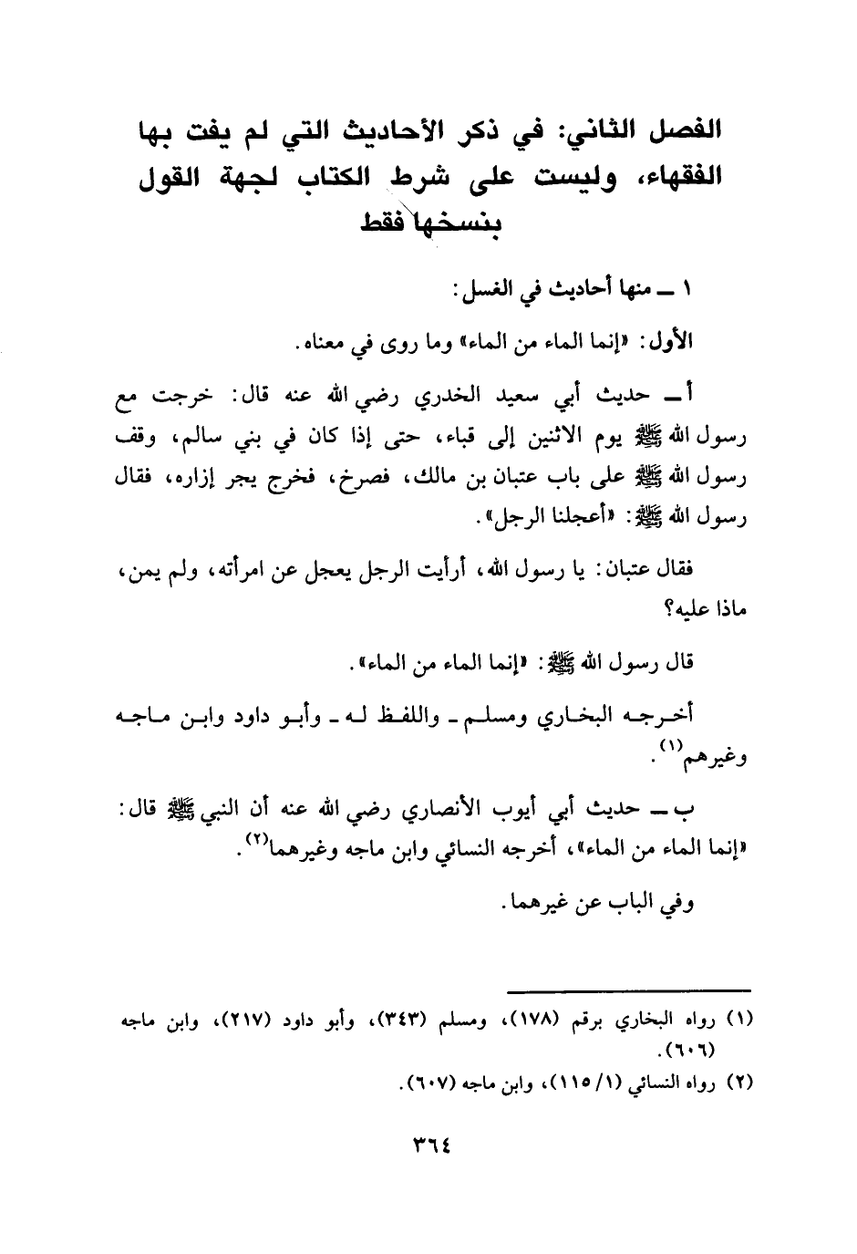 ب - حديث أبي أيوب الأنصاري رضي الله عنه أن النبي - صلى الله عليه وسلم - قال: " إنما الماء من الماء "، أخرجه النسائي وابن ماجه وغيرهما.