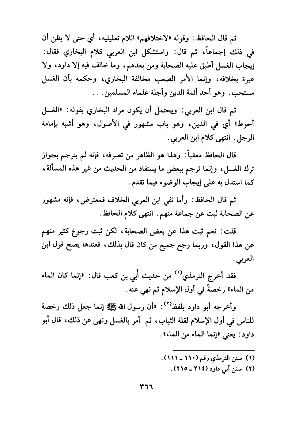 ثم قال الحافظ: وقوله " لاختلافهم " اللام تعليلية، أي حتى لا يظن أن في ذلك إجماعاً، ثم قال: واستشكل ابن العربي كلام البخاري فقال: إيجاب الغسل أطبق عليه الصحابة ومن بعدهم، وما خالف فيه إلا داود، ولا عبرة بخلافه، وإنما الأمر الصعب مخالفة البخاري، وحكمه بأن الغسل مستحب. وهو أحد أئمة الدين وأجلة علماء المسلمين. . .