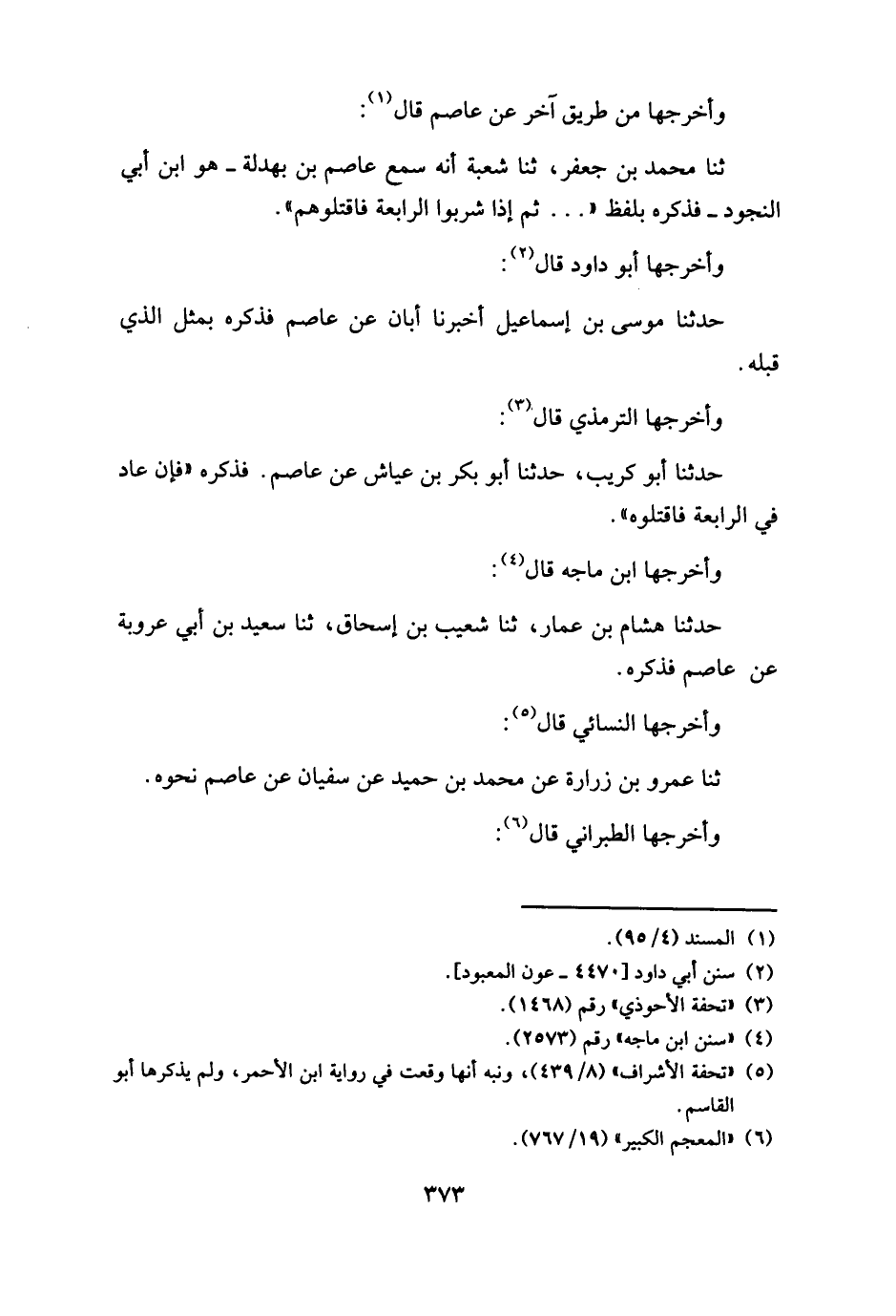 وأخرجها الترمذي قال: حدثنا أبو كريب، حدثنا أبو بكر بن عياش عن عاصم. فذكره " فإن عاد في الرابعة فاقتلوه ".