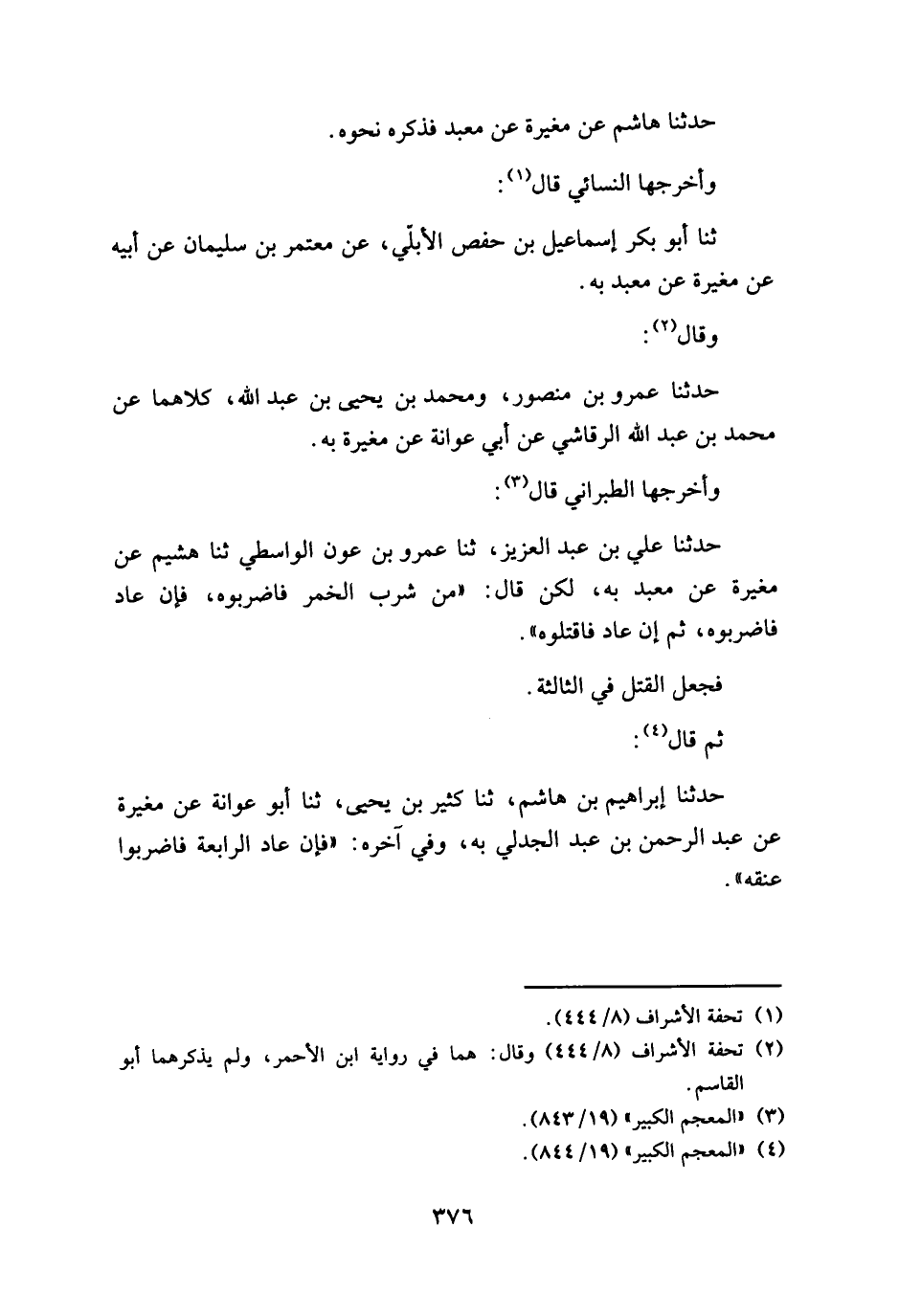 وأخرجها الطبراني قال: حدثنا علي بن عبد العزيز، ثنا عمرو بن عون الواسطي ثنا هشيم عن مغيرة عن معبد به، لكن قال: " من شرب الخمر فاضربوه، فإن عاد فاضربوه، ثم إن عاد فاقتلوه ".