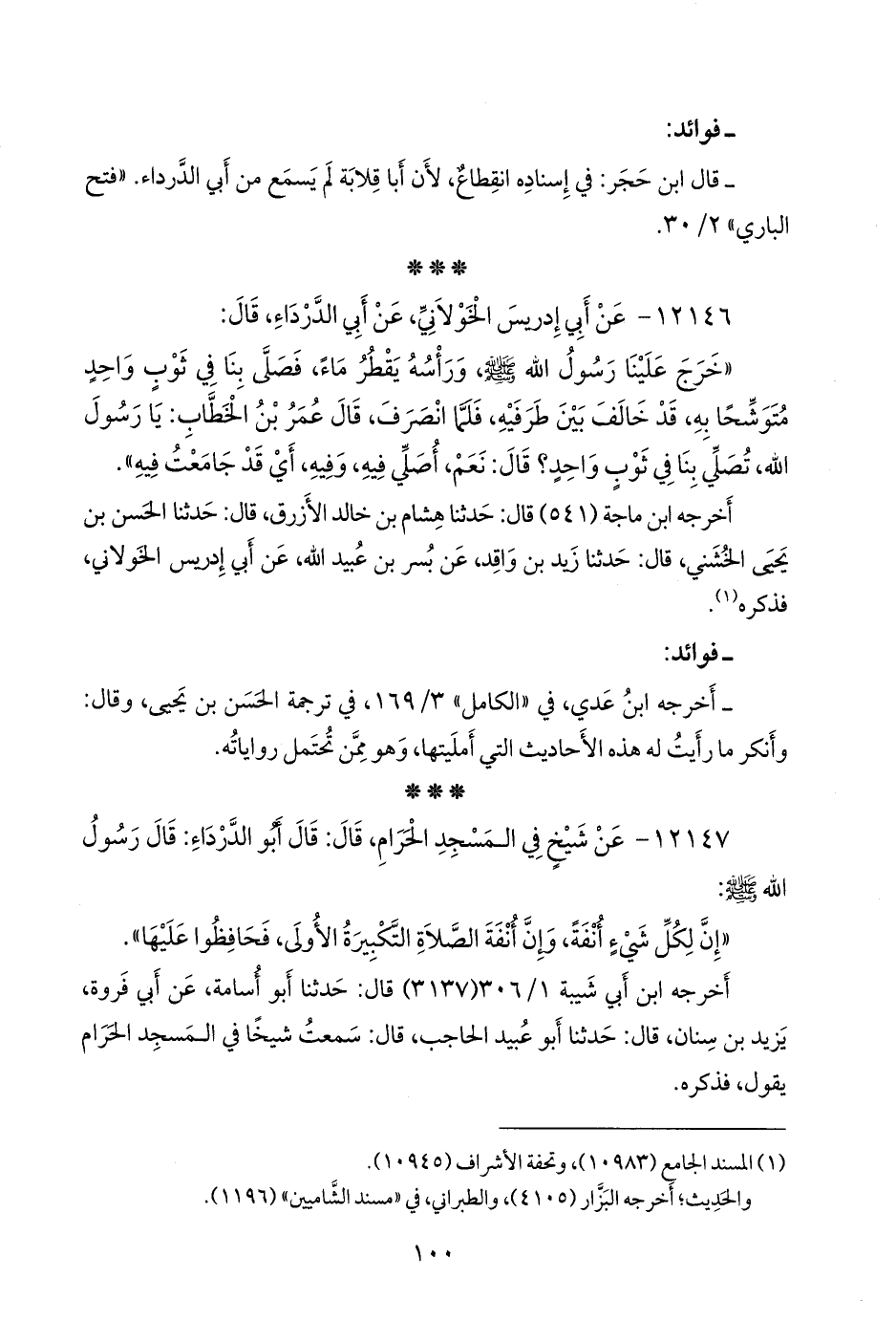 - قلنا: إِسناده ضعيفٌ؛ قال ابن حجر: في إسناده انقطاع، لأن أبا قلابة لم يسمع من أبي الدرداء. «فتح الباري» ٢/ ٣٠.