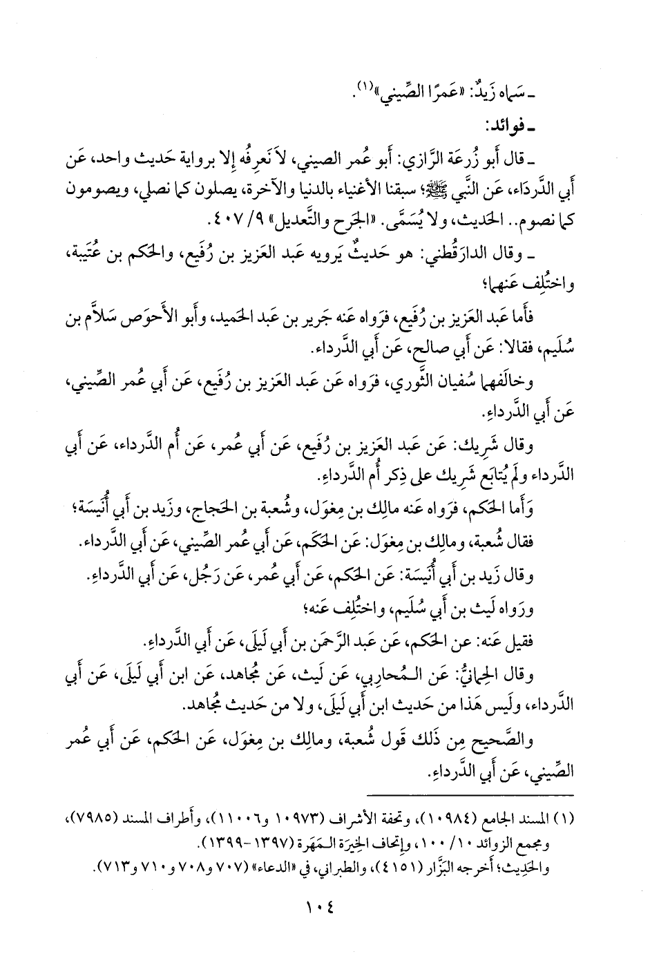 - قال أَبو زُرعَة الرازي: أَبو عمر الصيني، لا نعرفه إلا برواية حديث واحد، عن أبي الدرداء، عن النبي صَلى الله عَليه وسَلم؛ سبقنا الأغنياء بالدنيا والآخرة، يصلون كما نصلي، ويصومون كما نصوم .. الحديث، ولا يسمى. «الجرح والتعديل» ٩/ ٤٠٧.