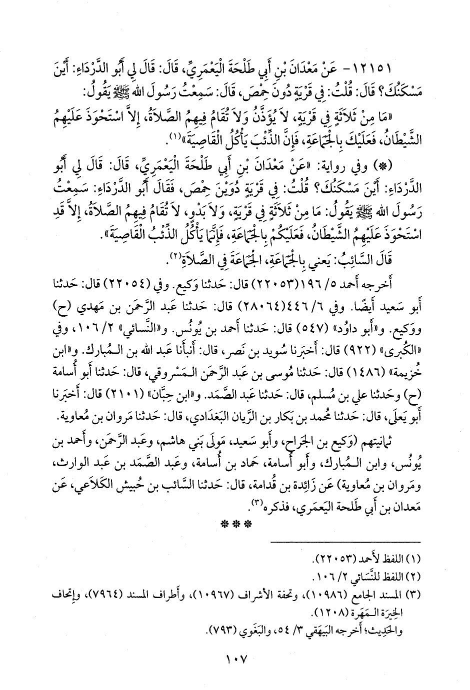 - وفي رواية: «عن معدان بن أبي طلحة اليعمري، قال: قال لي أَبو الدرداء: أين مسكنك؟ قلت: في قرية دوين حمص، فقال أَبو الدرداء: سمعت رسول الله صَلى الله عَليه وسَلم يقول: ما من ثلاثة في قرية، ولا بدو، لا تقام فيهم الصلاة، إلا قد استحوذ عليهم الشيطان، فعليكم بالجماعة، فإنما يأكل الذئب القاصية».