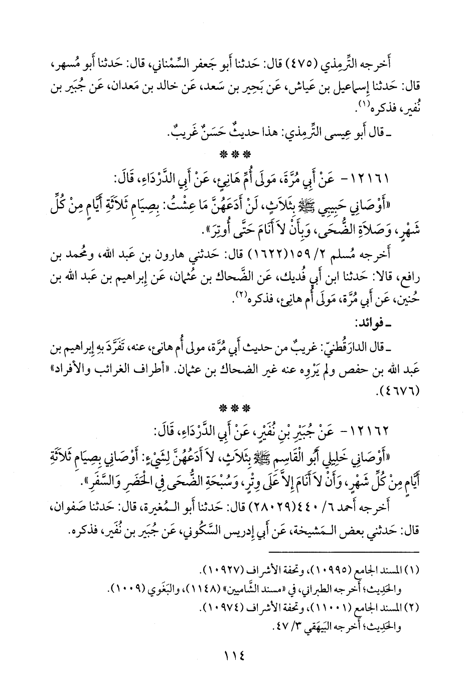 «أوصاني خليلي أَبو القاسم صَلى الله عَليه وسَلم بثلاث، لا أدعهن لشيء: أوصاني بصيام ثلاثة أيام من كل شهر، وأن لا أنام إلا على وتر، وسبحة الضحى في الحضر والسفر».
