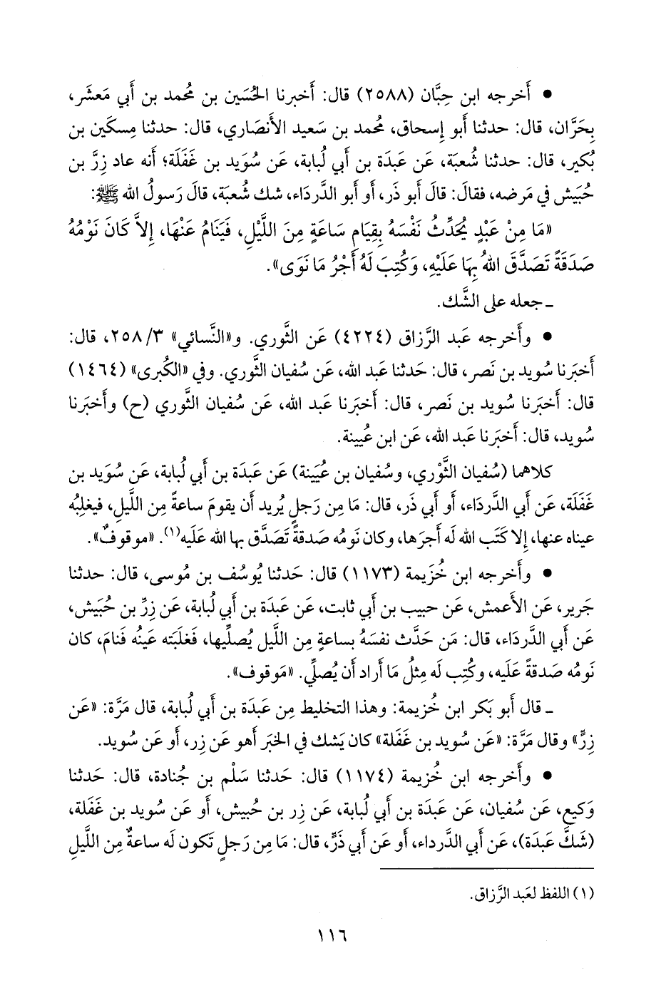 كلاهما (سفيان الثوري، وسفيان بن عُيينة) عن عبدة بن أبي لبابة، عن سويد بن غفلة، عن أبي الدرداء، أو أبي ذر، قال: ما من رجل يريد أن يقوم ساعة من الليل، فيغلبه عيناه عنها، إلا كتب الله له أجرها، وكان نومه صدقة تصدق بها الله عليه (¬١). «موقوف».