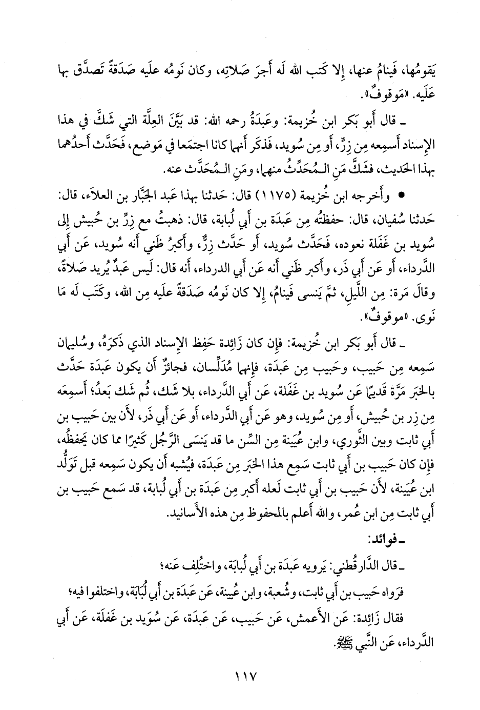 - قال ابن خزيمة: فإن كان زائدة حفظ الإسناد الذي ذكره، وسليمان سمعه من حبيب، وحبيب من عبدة، فإنهما مدلسان، فجائز أن يكون عبدة حدث بالخبر مرة قديما عن سويد بن غفلة، عن أبي الدرداء، بلا شك، ثم شك بعد؛ أسمعه من زِرّ بن حُبَيش، أو من سويد، وهو عن أبي الدرداء، أو عن أبي ذر، لأن بين حبيب بن أبي ثابت وبين الثوري، وابن عُيينة من السن ما قد ينسى الرجل كثيرا مما كان يحفظه، فإن كان حبيب بن أبي ثابت سمع هذا الخبر من عبدة، فيشبه أن يكون سمعه قبل تولد ابن عُيينة، لأن حبيب بن أبي ثابت لعله أكبر من عبدة بن أبي لبابة، قد سمع حبيب بن أبي ثابت من ابن عمر، والله أعلم بالمحفوظ من هذه الأسانيد.