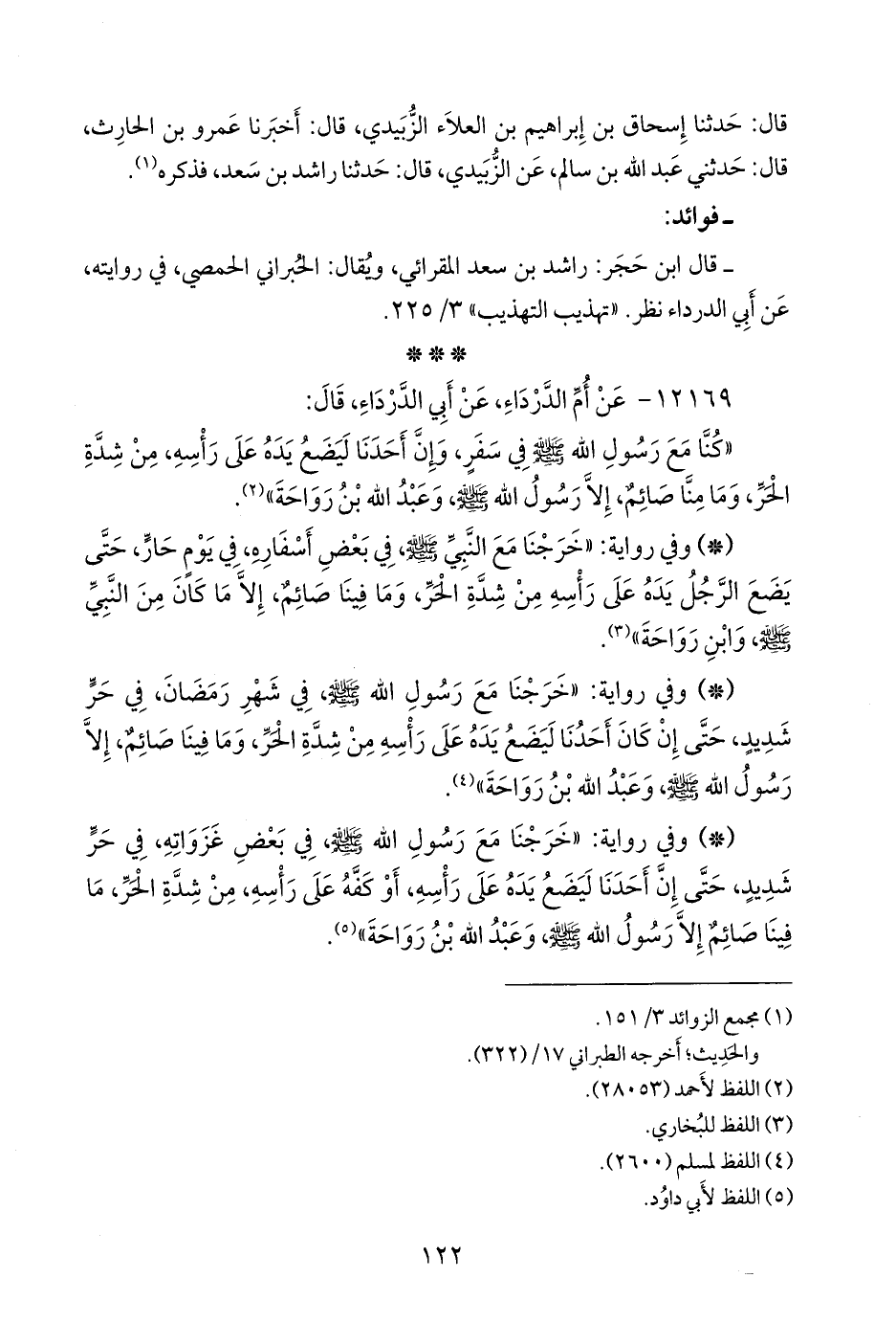 - وفي رواية: «خرجنا مع النبي صَلى الله عَليه وسَلم في بعض أسفاره، في يوم حار، حتى يضع الرجل يده على رأسه من شدة الحر، وما فينا صائم، إلا ما كان من النبي صَلى الله عَليه وسَلم وابن رَوَاحة» (¬٢).