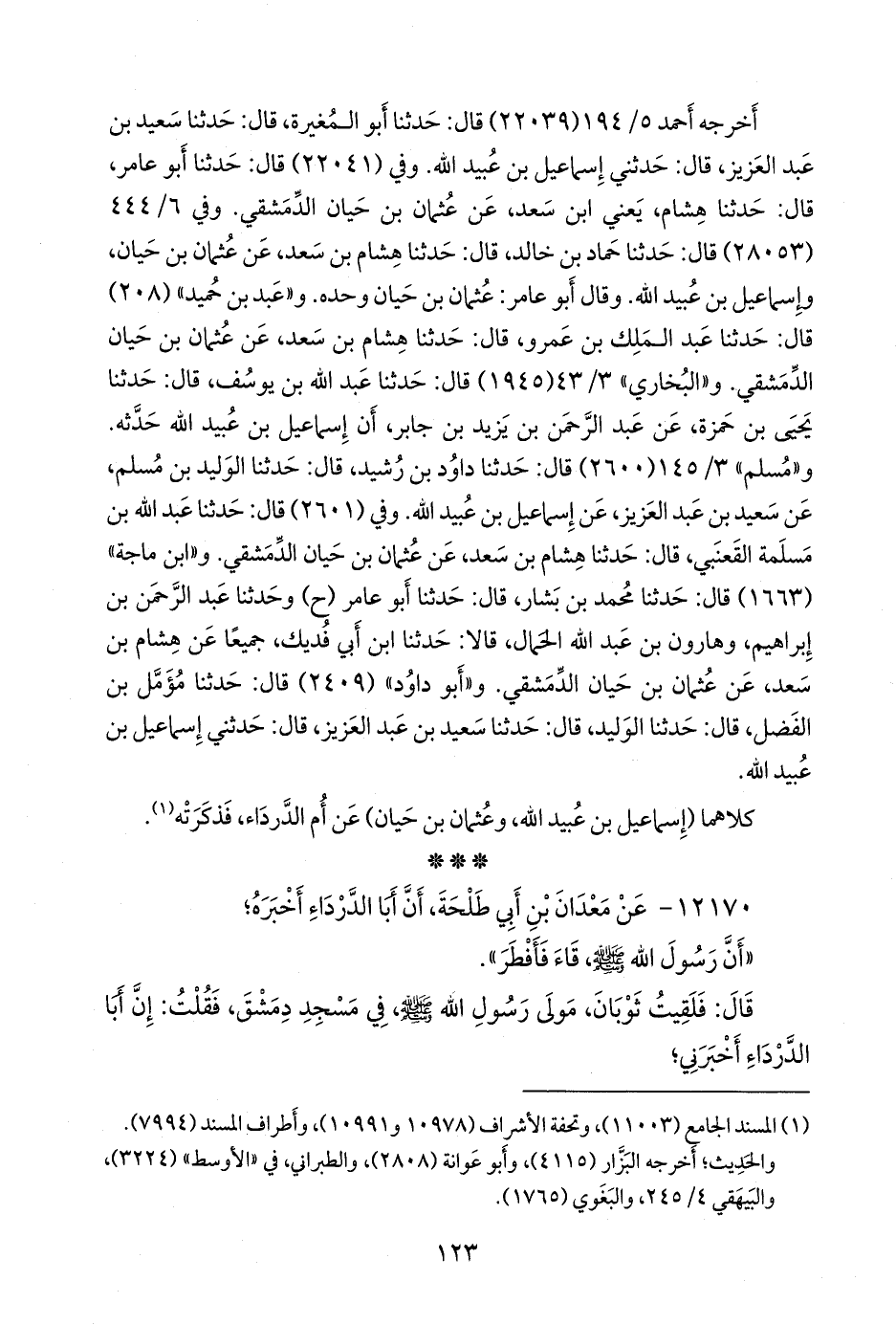 قال: فلقيت ثوبان مولى رسول الله صَلى الله عَليه وسَلم في مسجد دمشق، فقلت: إن أبا الدرداء أخبرني؛
