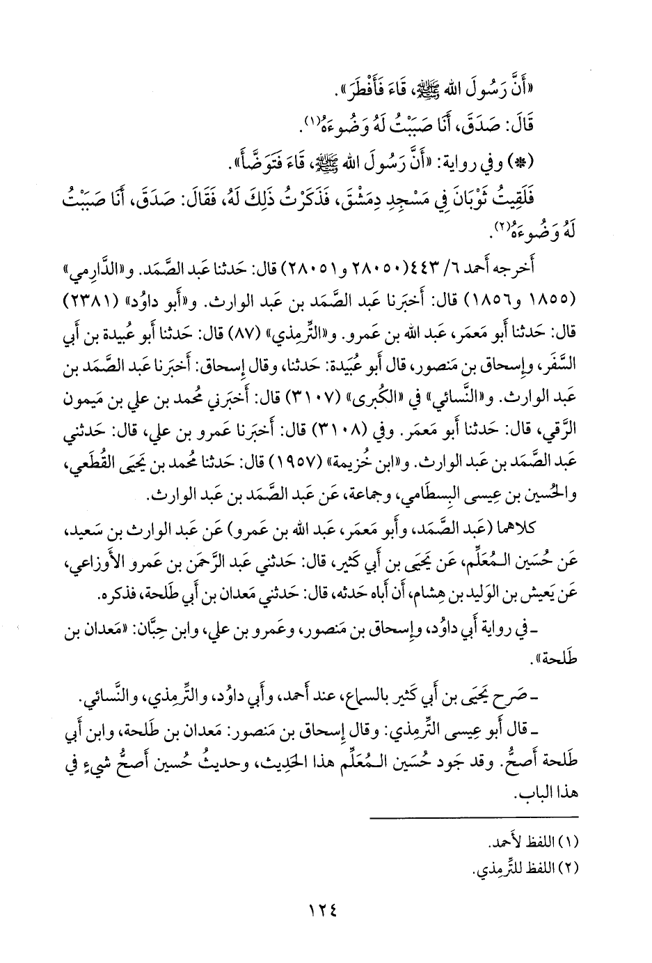 - قال التِّرمِذي: وقال إسحاق بن منصور: معدان بن طلحة، وابن أبي طلحة أصح. وقد جود حسين المُعَلِّم هذا الحديث، وحديث حسين أصح شيء في هذا الباب
