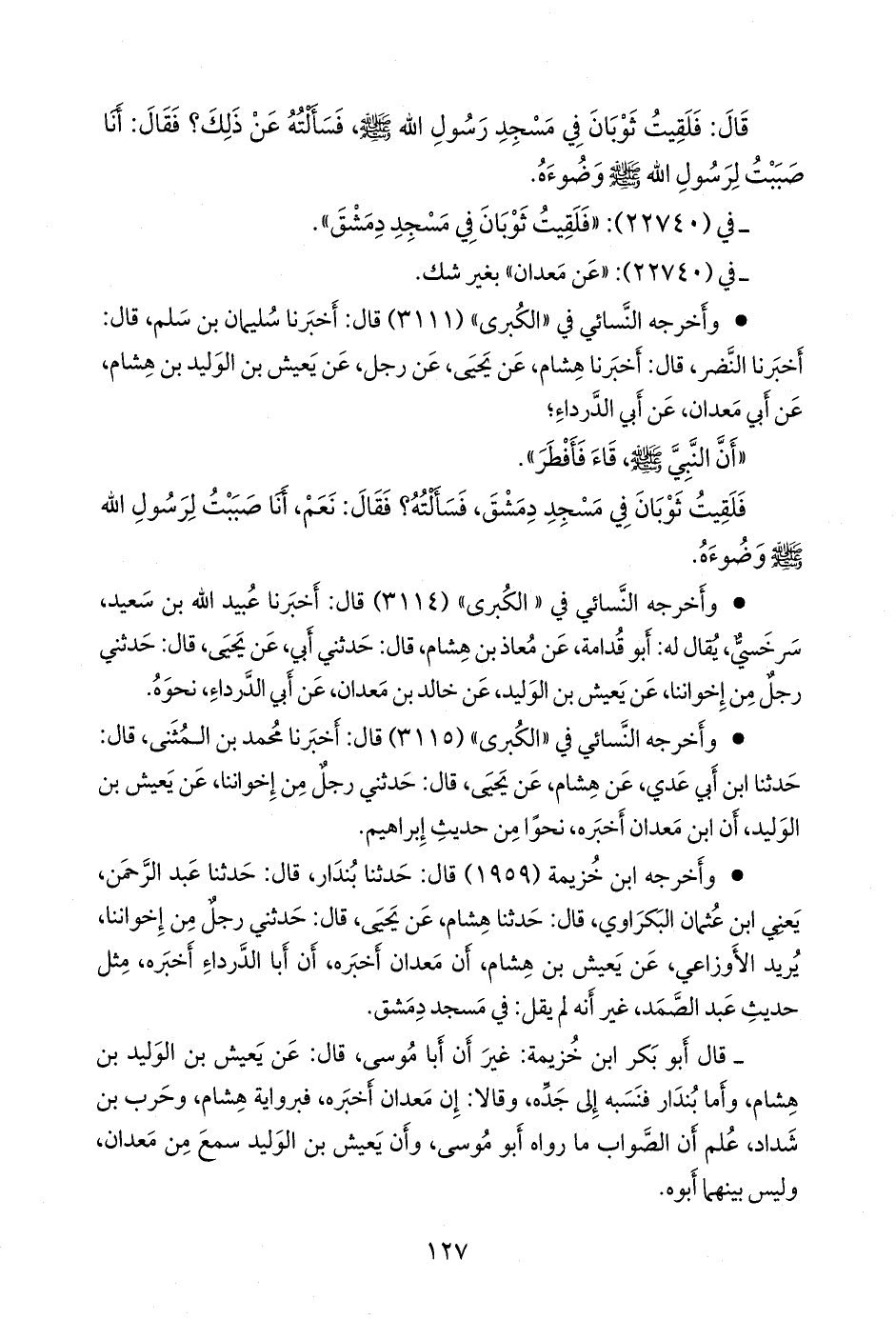 • وأخرجه النَّسَائي في «الكبرى» (٣١١٤) قال: أخبرنا عُبيد الله بن سعيد، سرخسي، يقال له: أَبو قدامة، عن معاذ بن هشام، قال: حدثني أبي، عن يحيى، قال: حدثني رجل من إخواننا، عن يعيش بن الوليد، عن خالد بن مَعدان، عن أبي الدرداء، نحوه.