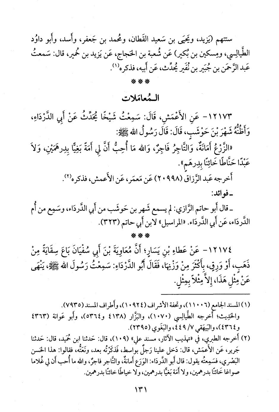 - قلنا: إِسناده ضعيفٌ؛ لم يسمع شهر بن حوشب من أبي الدرداء، وسمع من أم الدرداء، عن أبي الدرداء. «المراسيل» لابن أبي حاتم (٣٢٣).
