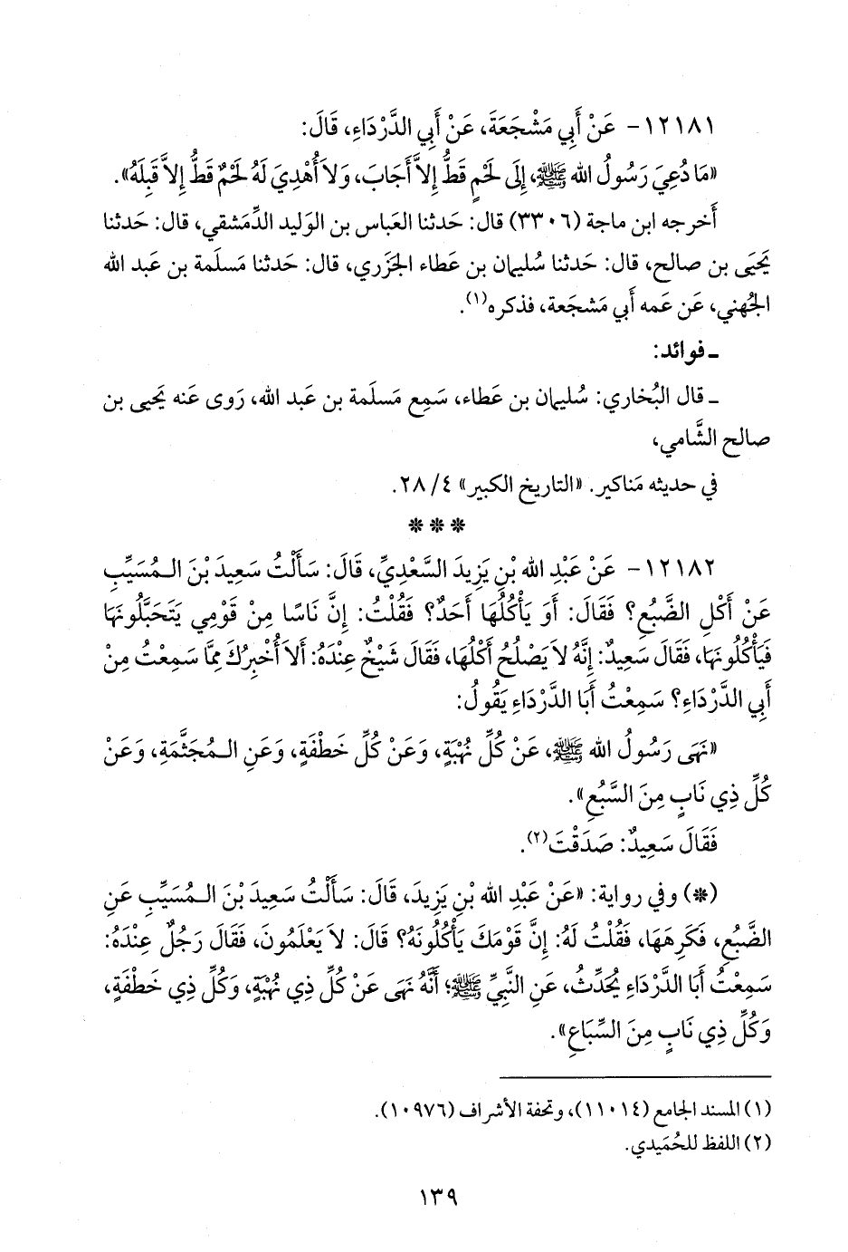 ١٢١٨٢ - عن عبد الله بن يزيد السعدي، قال: سألت سعيد بن المُسَيب عن أكل الضبع؟ فقال: أو يأكلها أحد؟ فقلت: إن ناسا من قومي يتحبلونها فيأكلونها، فقال سعيد: إنه لا يصلح أكلها، فقال شيخ عنده: ألا أخبرك مما سمعت من أبي الدرداء؟ سمعت أبا الدرداء يقول: