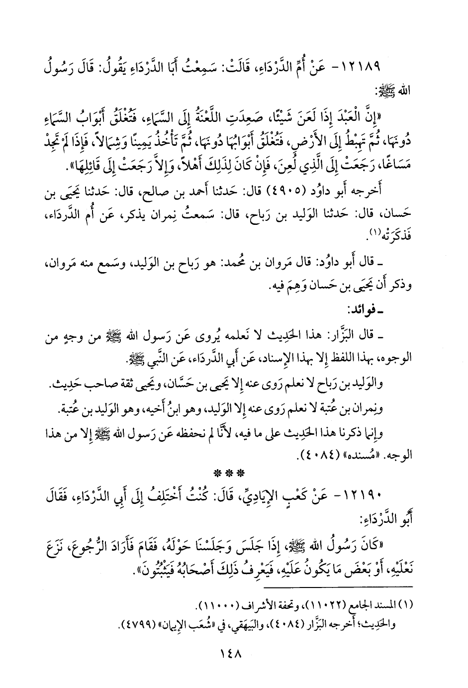 ١٢١٨٩ - عن أم الدرداء، قالت: سمعت أبا الدرداء يقول: قال رسول الله صَلى الله عَليه وسَلم:
