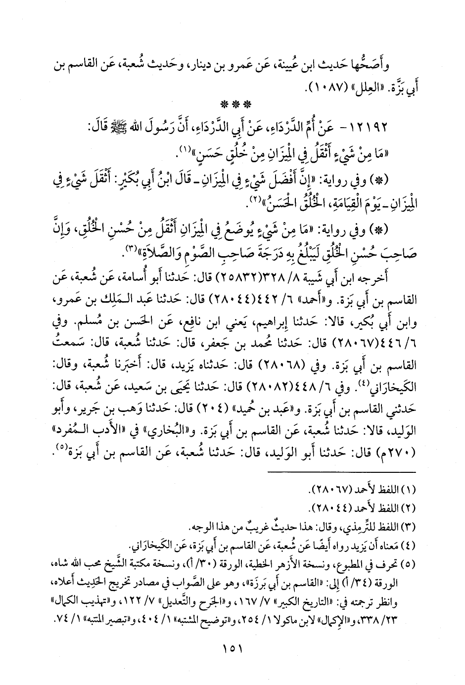 (¬٥) تصحف في المطبوع، ونسخة الأزهر الخطية، الورقة (٣٠/ أ)، ونسخة مكتبة الشيخ محب الله شاه، الورقة (٣٤/ أ) إلى: «القاسم بن أبي بَرزة»، وهو على الصواب في مصادر تخريج الحديث أعلاه، وانظر ترجمته في: «التاريخ الكبير» ٧/ ١٦٧، و «الجرح والتعديل» ٧/ ١٢٢، و «تهذيب الكمال» ٢٣/ ٣٣٨، و «الإكمال» لابن ماكولا ١/ ٢٥٤، و «توضيح المُشْتَبِه» ١/ ٤٠٤، و «تبصير المنتبه» ١/ ٧٤.