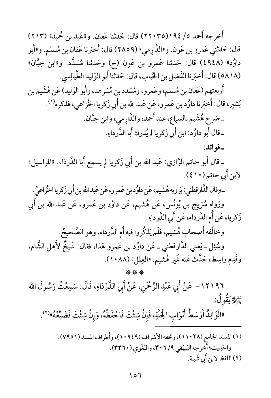 - قلنا: إِسناده ضعيفٌ؛ قال أَبو حاتم الرازي: عبد الله بن أبي زكريا لم يسمع أبا الدرداء. «المراسيل» لابن أبي حاتم (٤١٠).
