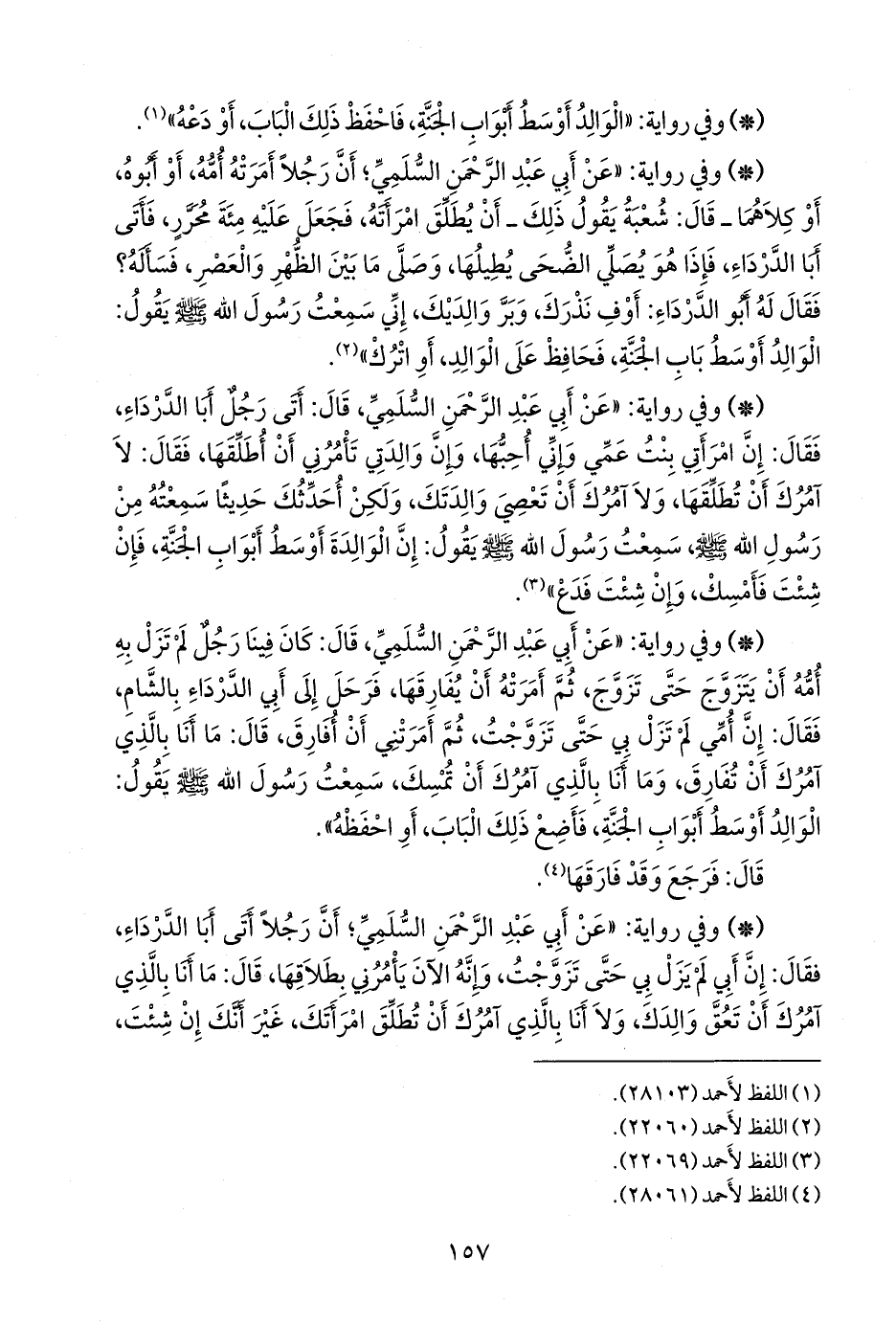 - وفي رواية: «عن أبي عبد الرَّحمَن السُّلَمي، قال: كان فينا رجل لم تزل به أمه أن يتزوج حتى تزوج، ثم أمرته أن يفارقها، فرحل إلى أبي الدرداء بالشام، فقال: إن أمي لم تزل بي حتى تزوجت، ثم أمرتني أن أفارق، قال: ما أنا بالذي آمرك أن تفارق، وما أنا بالذي آمرك أن تمسك، سمعت رسول الله صَلى الله عَليه وسَلم يقول: الوالد أوسط أَبواب الجنة، فأضع ذلك الباب، أو احفظه».