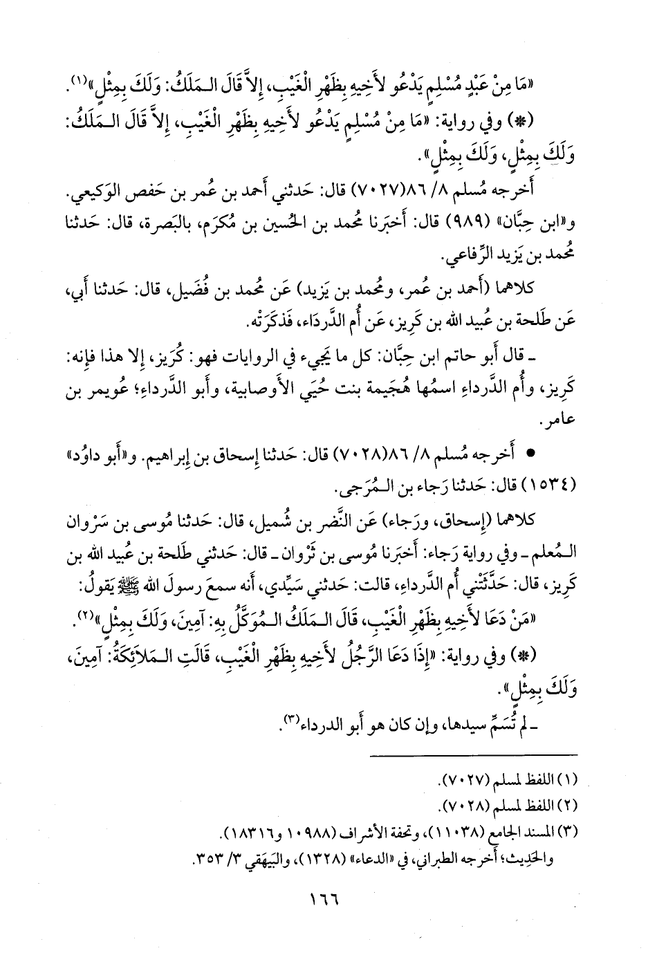 - وفي رواية: «إذا دعا الرجل لأخيه بظهر الغيب، قالت الملائكة: آمين، ولك بمثل».