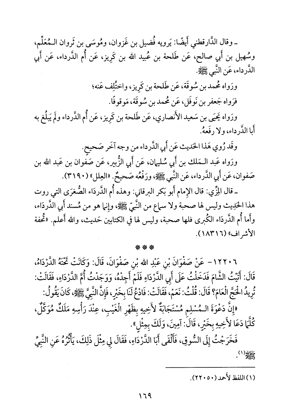 ١٢٢٠٦ - عن صفوان بن عبد الله بن صفوان، قال: وكانت تحته الدرداء، قال: أتيت الشام فدخلت على أبي الدرداء فلم أجده، ووجدت أم الدرداء، فقالت: تريد الحج العام؟ قال: قلت: نعم، فقالت: فادع لنا بخير، فإن النبي صَلى الله عَليه وسَلم كان يقول: