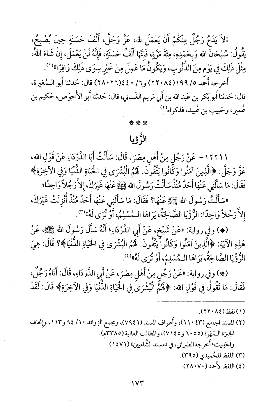 - وفي رواية: «عن شيخ، عن أبي الدرداء؛ أنه سأل رسول الله صَلى الله عَليه وسَلم عن هذه الآية: {الذين آمنوا وكانوا يتقون. لهم البشرى في الحياة الدنيا}؟ قال: هي الرؤيا الصالحة، يراها المسلم، أو ترى له» (¬٢).