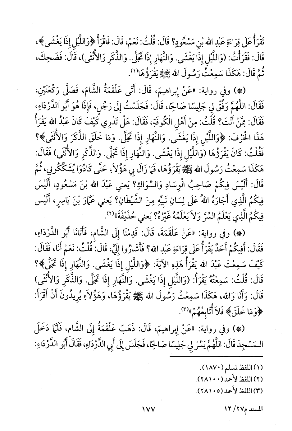- وفي رواية: «عن علقمة، قال: قدمنا إلى الشام، فأتانا أَبو الدرداء، فقال: أفيكم أحد يقرأ على قراءة عبد الله؟ فأشاروا إلي، قال: قلت: نعم أنا، فقال: كيف سمعت عبد الله يقرأ هذه الآية: {والليل إذا يغشى. والنهار إذا تجلى}؟ قال: قلت: سمعته يقرأ: (والليل إذا يغشى. والنهار إذا تجلى. والذكر والأنثى)، قال: وأنا والله، هكذا سمعت رسول الله صَلى الله عَليه وسَلم يقرؤها، وهؤلاء يريدون أن أقرأ: {وما خلق} فلا أتابعهم» (¬١).