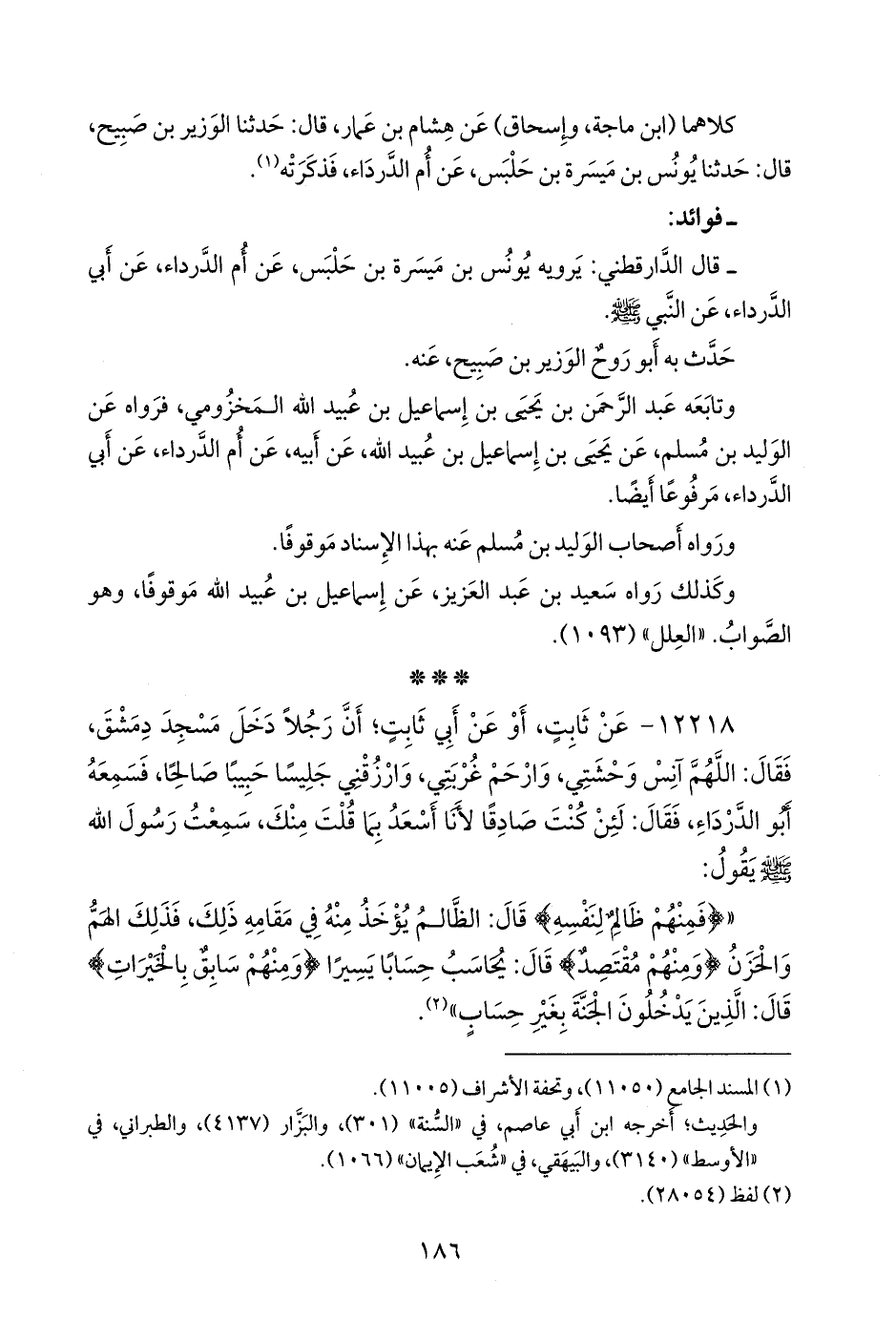 ١٢٢١٨ - عن ثابت، أو عن أبي ثابت؛ أن رجلا دخل مسجد دمشق، فقال: اللهم آنس وحشتي، وارحم غربتي، وارزقني جليسا حبيبا صالحا، فسمعه أَبو الدرداء، فقال: لئن كنت صادقا لأنا أسعد بما قلت منك، سمعت رسول الله صَلى الله عَليه وسَلم يقول:
