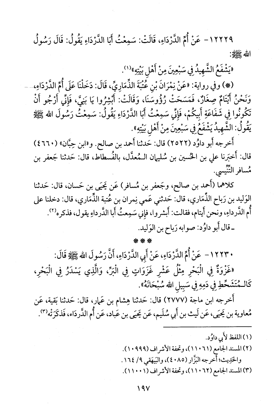 - وفي رواية: «عن نمران بن عُتبة الذِّمَاري، قال: دخلنا على أم الدرداء، ونحن أيتام صغار، فمسحت رؤوسنا، وقالت: أبشروا يا بني، فإني أرجو أن تكونوا في شفاعة أبيكم، فإني سمعت أبا الدرداء يقول: سمعت رسول الله صَلى الله عَليه وسَلم يقول: الشهيد يشفع في سبعين من أهل بيته».