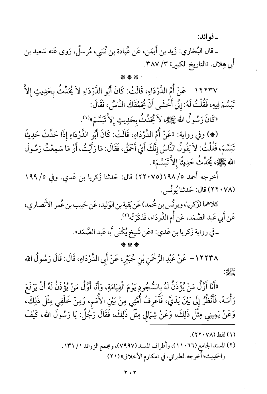 ١٢٢٣٧ - عن أم الدرداء، قالت: كان أَبو الدرداء لا يحدث بحديث إلا تبسم فيه، فقلت له: إني أخشى أن يحمقك الناس، فقال: