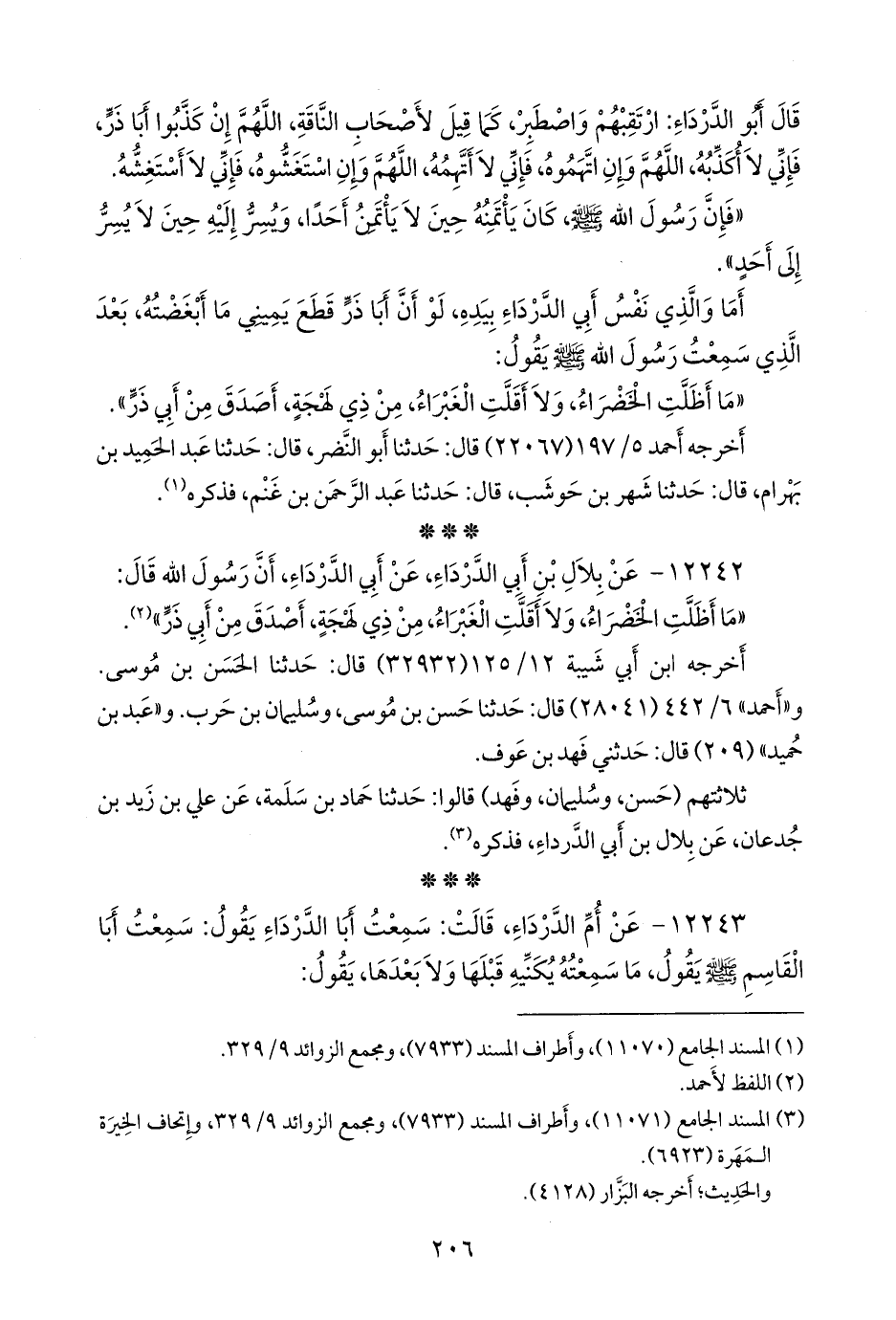 ١٢٢٤٣ - عن أم الدرداء، قالت: سمعت أبا الدرداء يقول: سمعت أبا القاسم صَلى الله عَليه وسَلم يقول، ما سمعته يكنيه قبلها ولا بعدها، يقول: