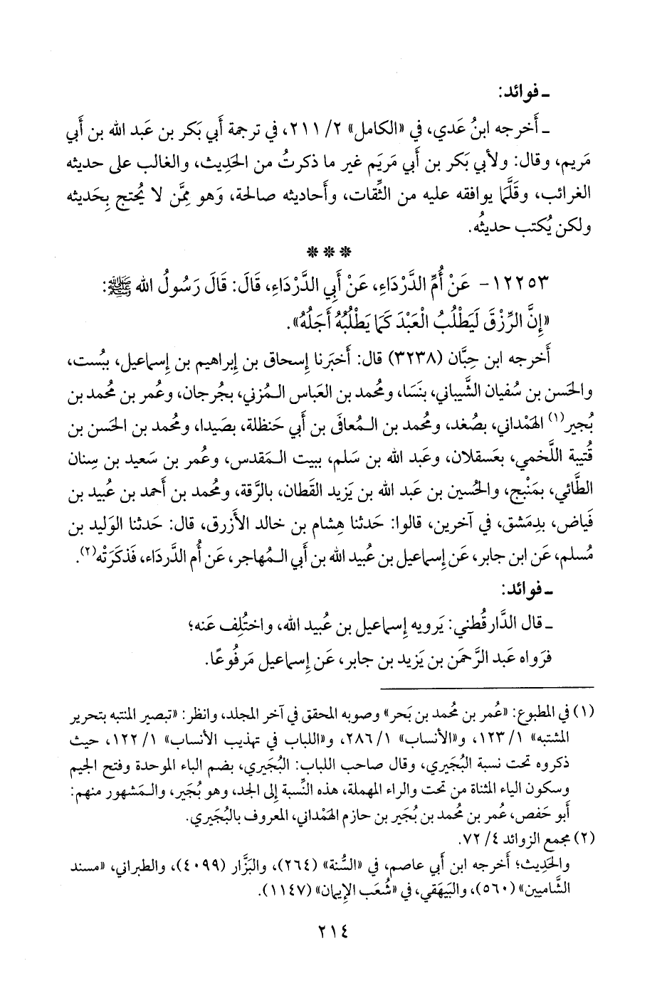 أخرجه ابن حبان (٣٢٣٨) قال: أخبرنا إسحاق بن إبراهيم بن إسماعيل، ببست، والحسن بن سفيان الشيباني، بنسا، ومحمد بن العباس المزني، بجرجان، وعمر بن محمد بن بجير (¬١) الهمداني، بصغد، ومحمد بن المعافى بن أبي حنظلة، بصيدا، ومحمد بن الحسن بن قتيبة اللخمي، بعسقلان، وعبد الله بن سلم، ببيت المقدس، وعمر بن سعيد بن سنان الطائي، بِمَنْبِج، والحسين بن عبد الله بن يزيد القطان، بالرَّقَّة، ومحمد بن أحمد بن عبيد بن فياض، بدمشق، في آخرين، قالوا: حدثنا هشام بن خالد الأزرق، قال: حدثنا الوليد بن مسلم، عن ابن جابر، عن إسماعيل بن عُبيد الله بن أبي المهاجر، عن أم الدرداء، فذكرته (¬٢).