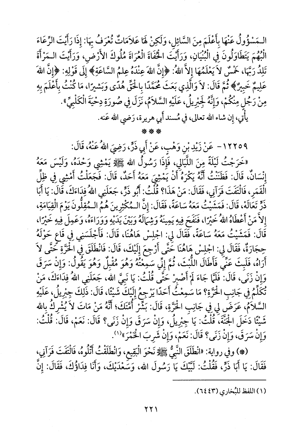 «خرجت ليلة من الليالي، فإذا رسول الله صَلى الله عَليه وسَلم يمشي وحده، وليس معه إنسان، قال: فظننت أنه يكره أن يمشي معه أحد، قال: فجعلت أمشي في ظل القمر، فالتفت فرآني، فقال: من هذا؟ قلت: أَبو ذر، جعلني الله فداءك، قال: يا أبا ذر تعاله، قال: فمشيت معه ساعة، فقال: إن المكثرين هم المقلون يوم القيامة، إلا من أعطاه الله خيرا، فنفح فيه يمينه وشماله وبين يديه ووراءه، وعمل فيه خيرا، قال: فمشيت معه ساعة، فقال لي: اجلس هاهنا، قال: فأجلسني في قاع حوله حجارة، فقال لي: اجلس هاهنا حتى أرجع إليك، قال: فانطلق في الحرة حتى لا أراه، فلبث عني فأطال اللبث، ثم إني سمعته وهو مقبل وهو يقول: وإن سرق وإن زنى، قال: فلما جاء لم أصبر حتى قلت: يا نبي الله، جعلني الله فداءك، من تكلم في جانب الحرة؟ ما سمعت أحدا يرجع إليك شيئا، قال: ذلك جبريل، عليه السلام، عرض لي في جانب الحرة، قال: بشر أمتك؛ أنه من مات لا يشرك بالله شيئًا دخل الجنة، قلت: يا جبريل، وإن سرق وإن زنى؟ قال: نعم، قال: قلت: وإن سرق، وإن زنى؟ قال: نعم، وإن شرب الخمر» (¬١).