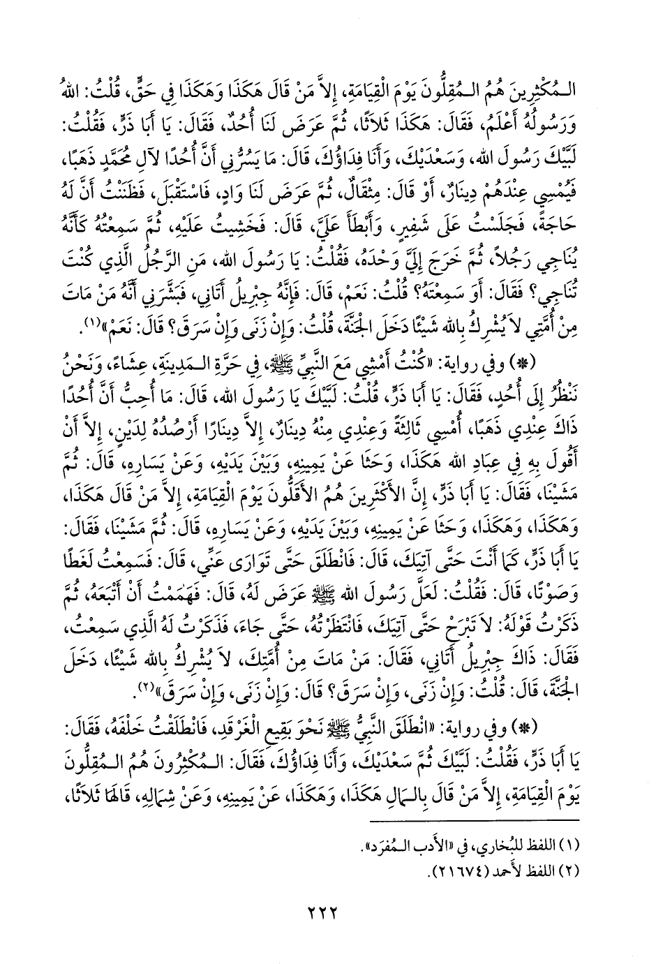 ثم عرض لنا أحد، فقال: يا أبا ذر، ما يسرني أنه لآل محمد ذهبا، يمسي معهم دينار، أو مثقال، فقلت: الله ورسوله أعلم، ثم عرض لنا واد، فاستبطنه النبي صَلى الله عَليه وسَلم ونزل فيه، وجلست على شفيره، فظننت أن له حاجة، فأبطأ علي وساء ظني، فسمعت مناجاة، فقال: ذلك جبريل يخبرني لأمتي؛ من شهد منهم أن لا إله إلا الله، وأن محمدا رسول الله، دخل الجنة، فقلت: يا رسول الله، وإن زنى، وإن سرق؟ قال: وإن زنى، وإن سرق» (¬١).