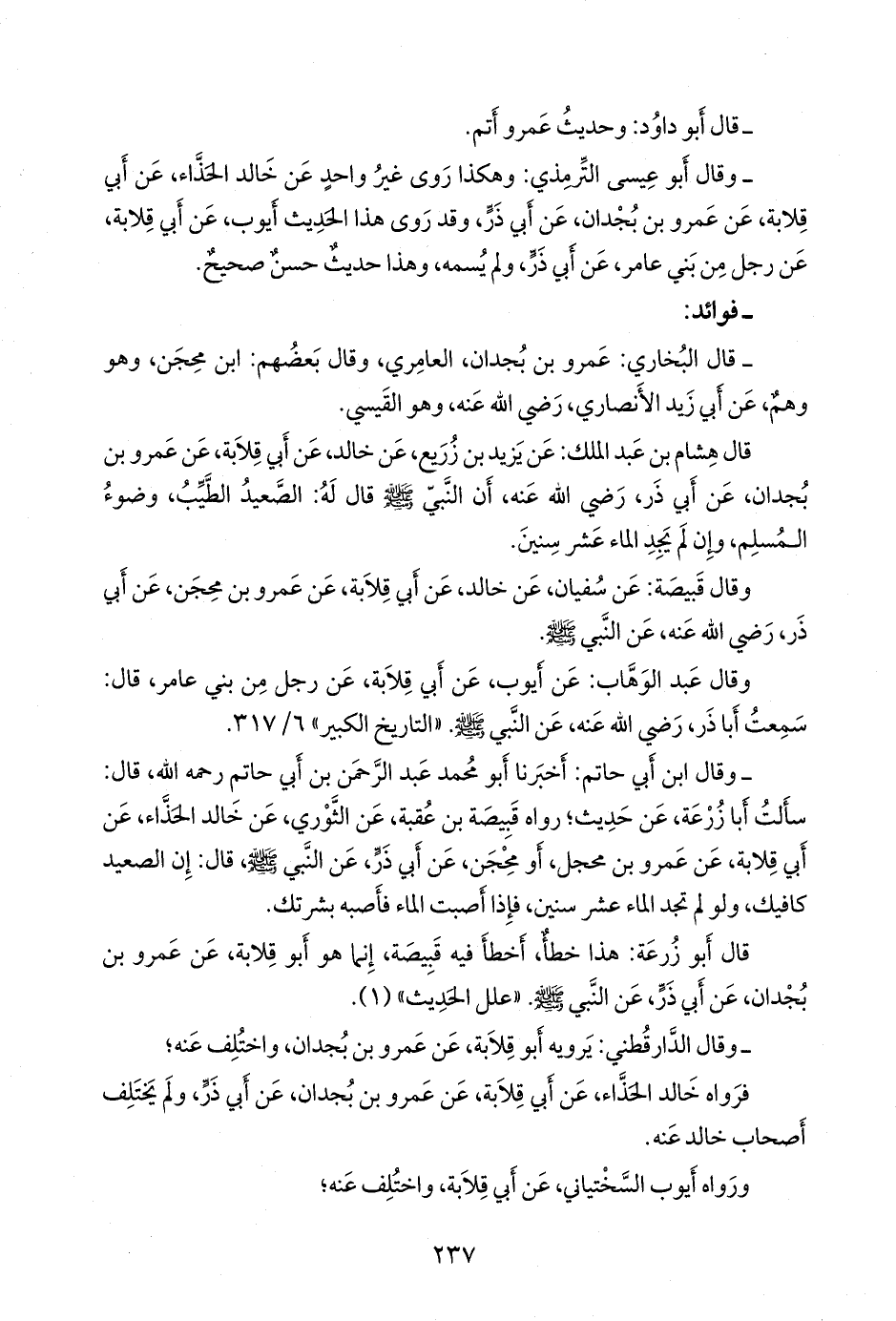 - وقال ابن أبي حاتم: أخبرنا أَبو محمد عبد الرَّحمَن بن أبي حاتم رحمه الله، قال: سألت أَبا زُرعَة، عن حديث؛ رواه قَبيصَة بن عُقبة، عن الثوري، عن خالد الحَذَّاء، عن أبي قلابة، عن عَمرو بن محجل، أو محجن، عن أبي ذر، عن النبي صَلى الله عَليه وسَلم قال: إن الصعيد كافيك، ولو لم تجد الماء عشر سنين، فإذا أصبت الماء فأصبه بشرتك.