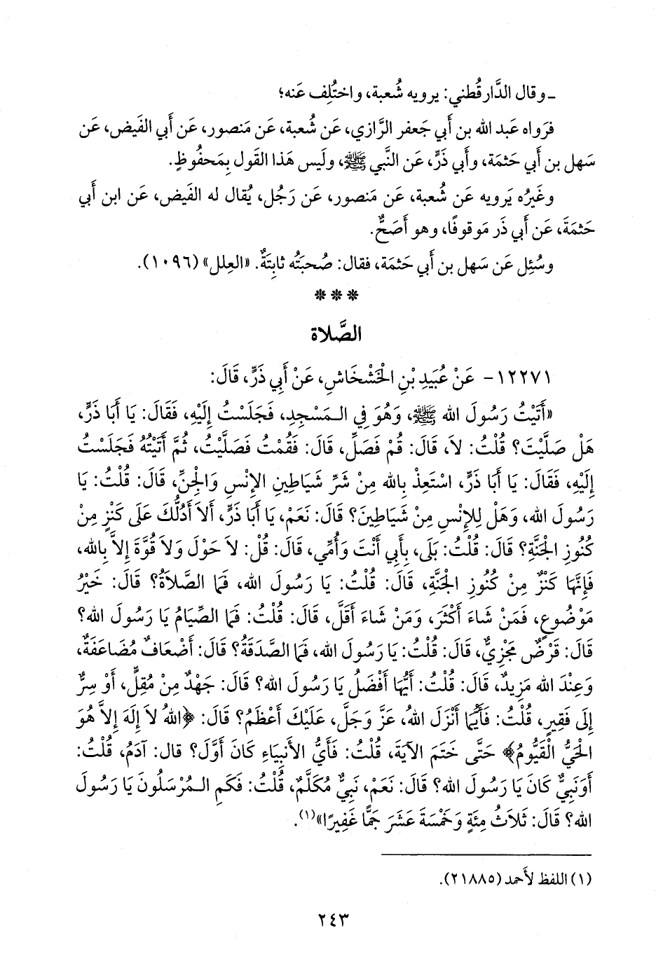 «أتيت رسول الله صَلى الله عَليه وسَلم وهو في المسجد، فجلست إليه، فقال: يا أبا ذر، هل صليت؟ قلت: لا، قال: قم فصل، قال: فقمت فصليت، ثم أتيته فجلست إليه، فقال: يا أبا ذر، استعذ بالله من شر شياطين الإنس والجن، قال: قلت: يا رسول الله، وهل للإنس من شياطين؟ قال: نعم، يا أبا ذر، ألا أدلك على كنز من كنوز الجنة؟ قال: قلت: بلى، بأبي أنت وأمي، قال: قل: لا حول ولا قوة إلا بالله، فإنها كنز من كنوز الجنة، قال: قلت: يا رسول الله، فما الصلاة؟ قال: خير موضوع، فمن شاء أكثر، ومن شاء أقل، قال: قلت: فما الصيام يا رسول الله؟ قال: قرض مجزي، قال: قلت: يا رسول الله، فما الصدقة؟ قال: أضعاف مضاعفة، وعند الله مزيد، قال: قلت: أيها أفضل يا رسول الله؟ قال: جهد من مقل، أو سر إلى فقير، قلت: فأيما أنزل الله، عز وجل، عليك أعظم؟ قال: {الله لا إله إلا هو الحي القيوم} حتى ختم الآية، قلت: فأي الأنبياء كان أول؟ قال: آدم، قلت: أونبي كان يا رسول الله؟ قال: نعم، نبي مكلم، قلت: فكم المرسلون يا رسول الله؟ قال: ثلاث مئة وخمسة عشر جما غفيرا» (¬١).