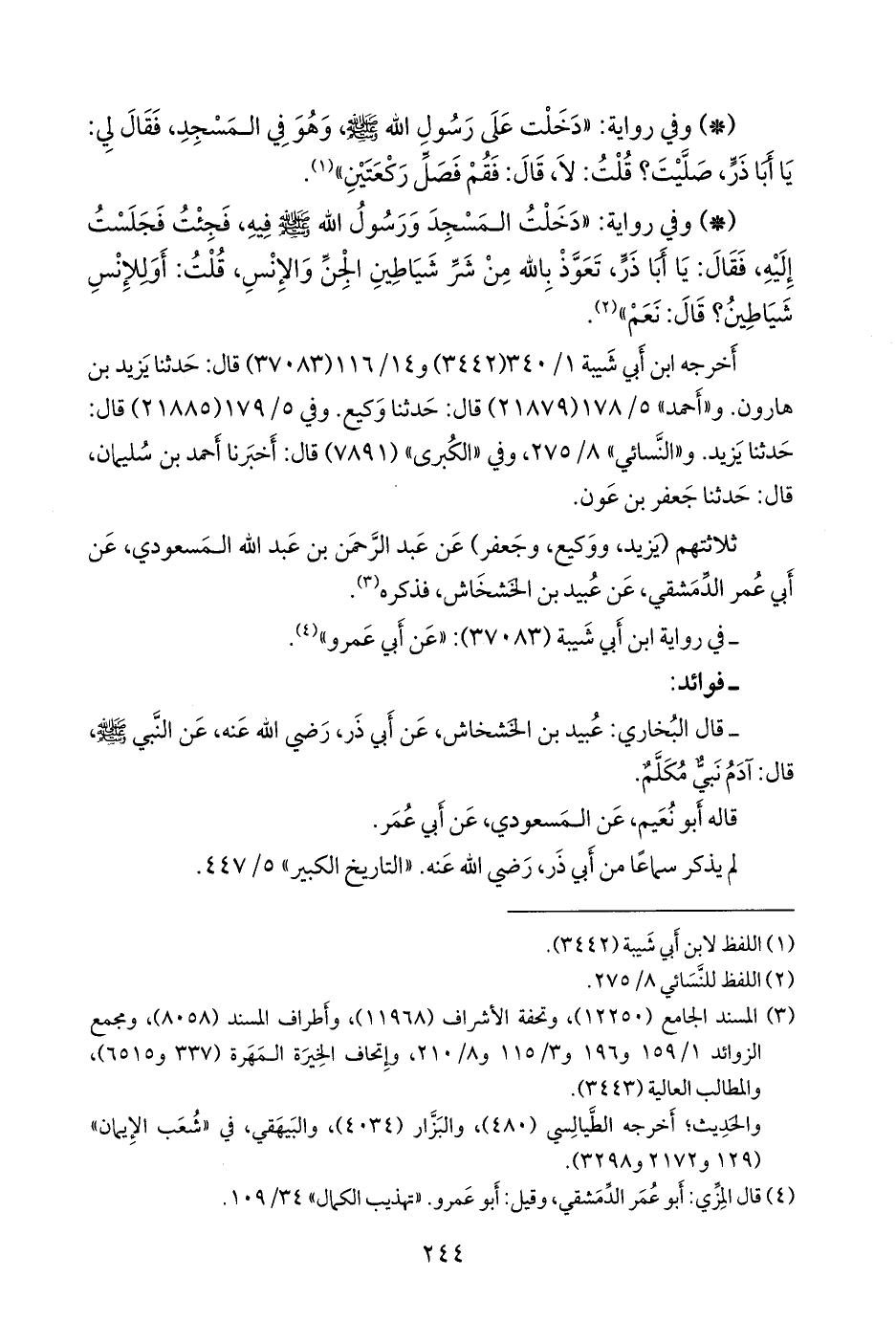 - وفي رواية: «دخلت المسجد ورسول الله صَلى الله عَليه وسَلم فيه، فجئت فجلست إليه، فقال: يا أبا ذر، تعوذ بالله من شر شياطين الجن والإنس، قلت: أوللإنس شياطين؟ قال: نعم» (¬٢).
