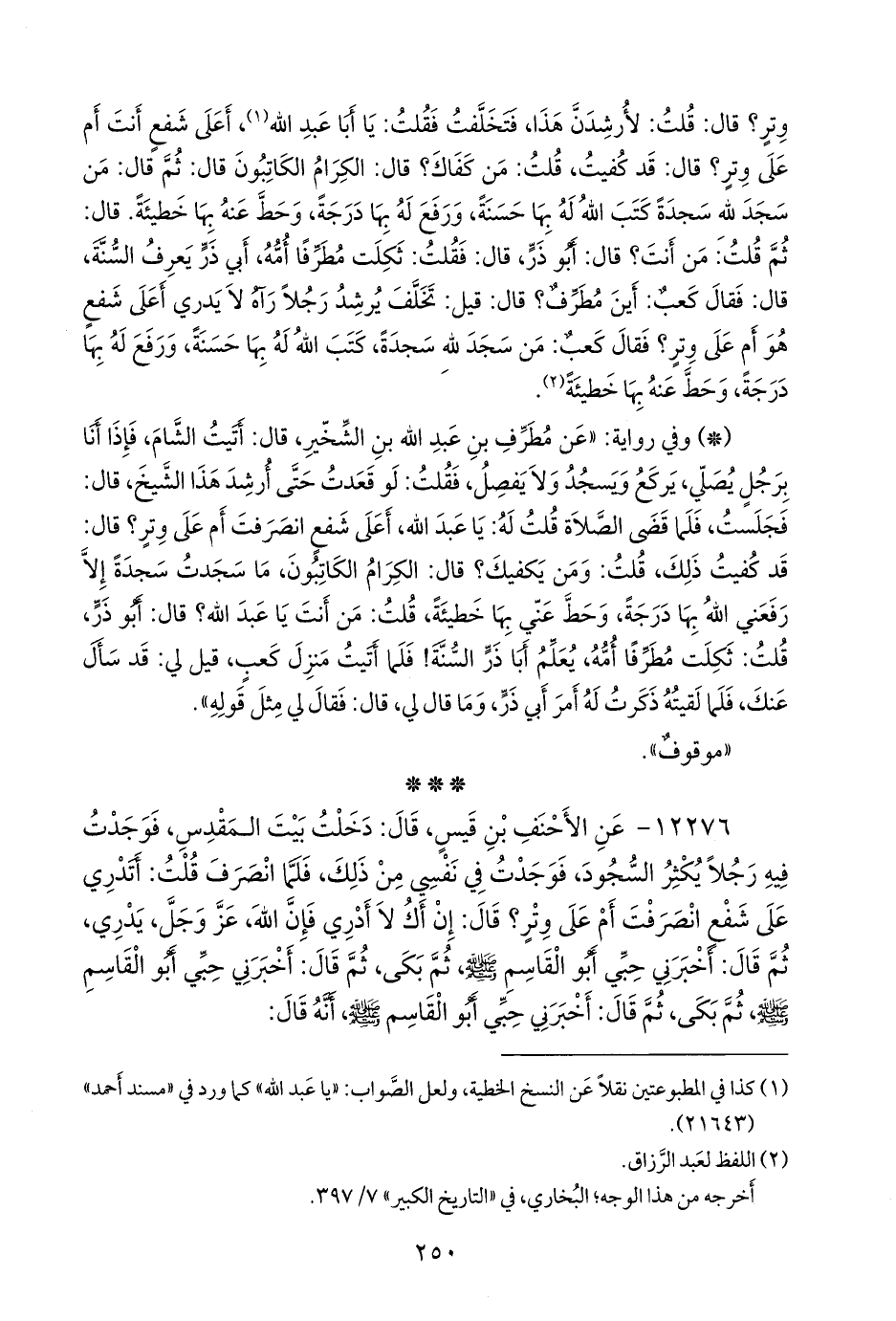 ١٢٢٧٦ - عن الأحنف بن قيس، قال: دخلت بيت المقدس، فوجدت فيه رجلا يكثر السجود، فوجدت في نفسي من ذلك، فلما انصرف قلت: أتدري على شفع انصرفت أم على وتر؟ قال: إن أك لا أدري فإن الله، عز وجل، يدري، ثم قال: أخبرني حبي أَبو القاسم صَلى الله عَليه وسَلم ثم بكى، ثم قال: أخبرني حبي أَبو القاسم صَلى الله عَليه وسَلم ثم بكى، ثم قال: أخبرني حبي أَبو القاسم صَلى الله عَليه وسَلم أنه قال: