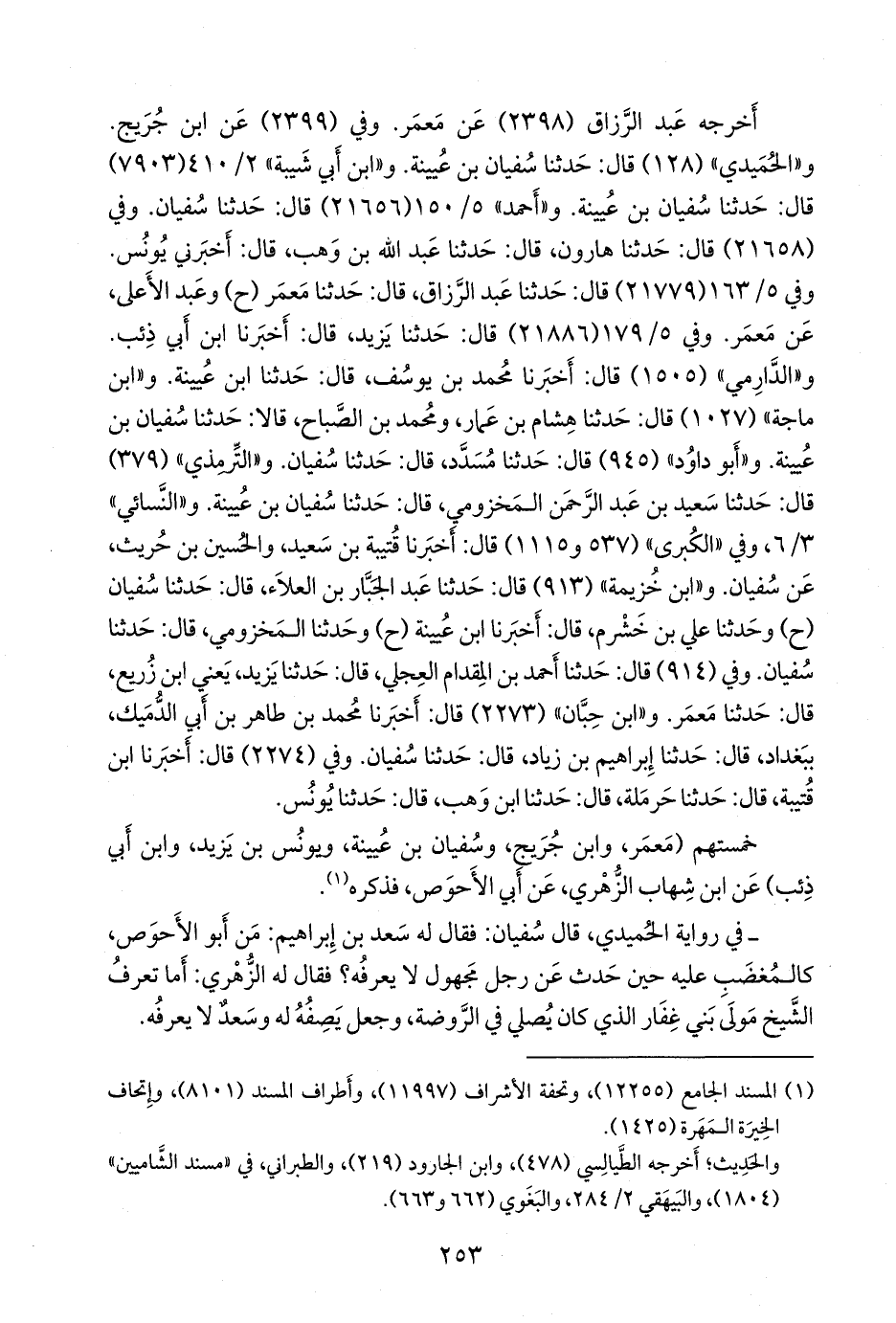 ـ في رواية الحميدي، قال سفيان: فقال له سعد بن إبراهيم: من أَبو الأحوص، كالمغضب عليه حين حدث عن رجل مجهول لا يعرفه؟ فقال له الزُّهْري: أما تعرف الشيخ مولى بني غفار الذي كان يصلي في الروضة، وجعل يصفه له وسعد لا يعرفه.