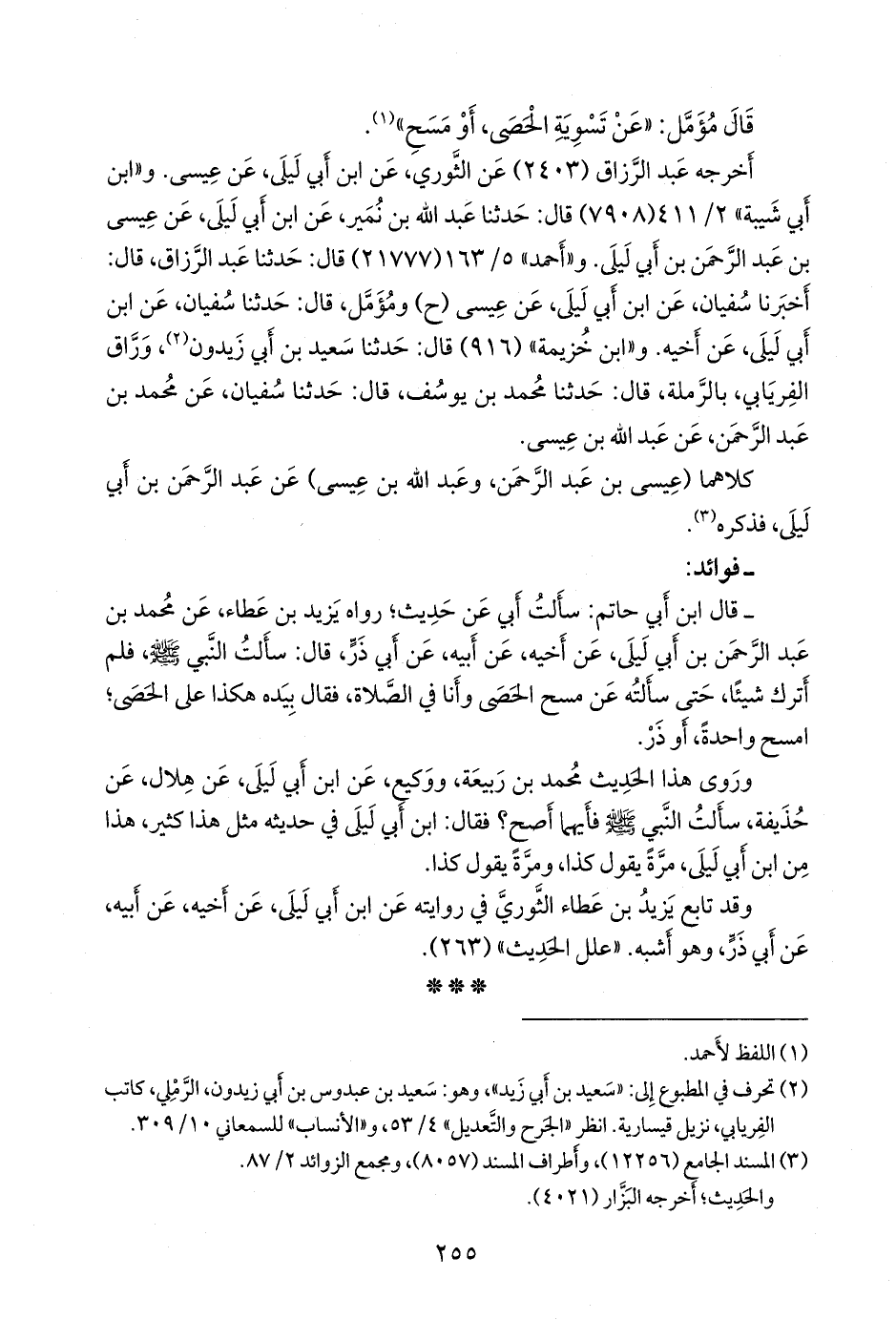 - قال عبد الرَّحمَن بن أبي حاتم الرازي: سألتُ أبي عن حديثٍ؛ رواه يزيد بن عطاء، عن محمد بن عبد الرَّحمَن بن أبي ليلى، عن أخيه، عن أبيه، عن أبي ذر، قال: سألت النبي صَلى الله عَليه وسَلم فلم أترك شيئا، حتى سألته عن مسح الحصى وأنا في الصلاة، فقال بيده هكذا على الحصى؛ امسح واحدة، أو ذر.