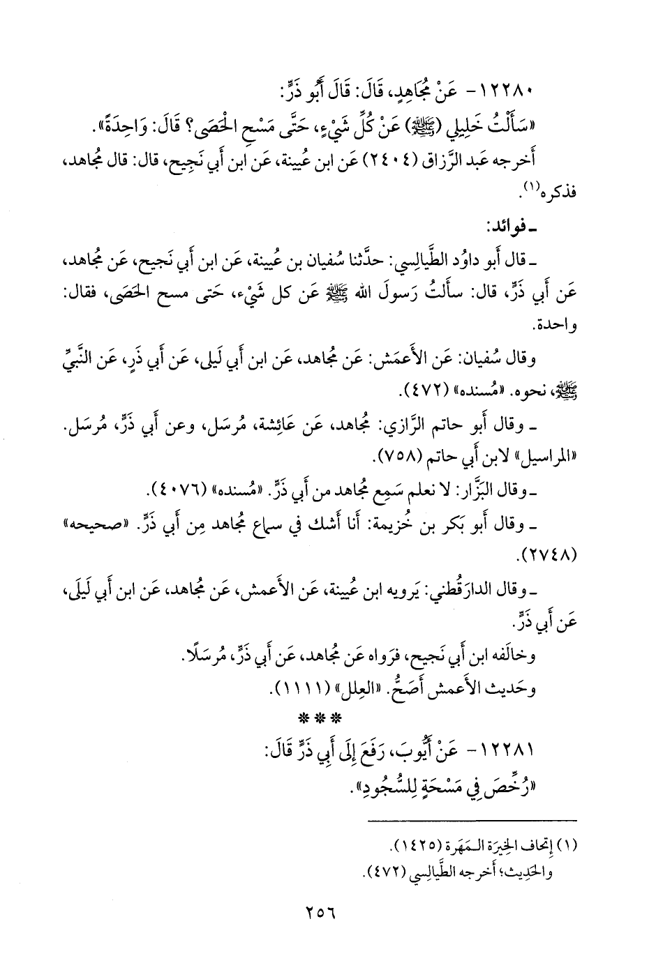 - وقال أَبو حاتم الرازي: مجاهد، عن عائشة، مرسل، وعن أبي ذر، مرسل. «المراسيل» لابن أبي حاتم (٧٥٨).